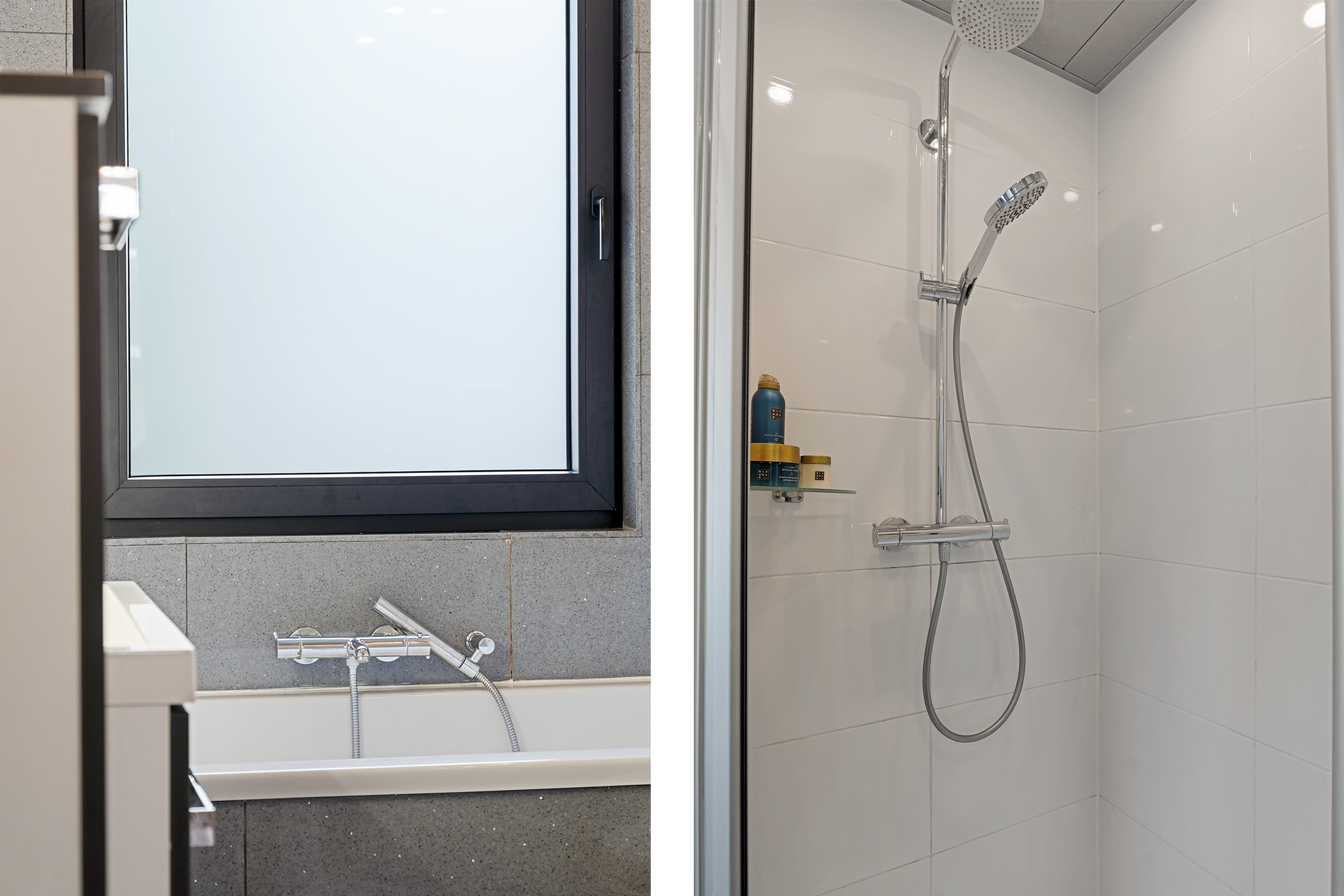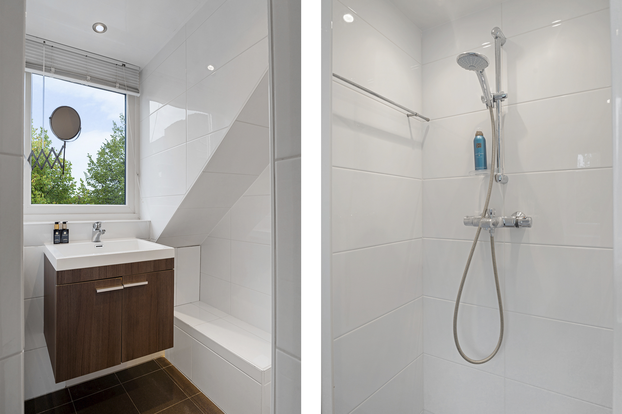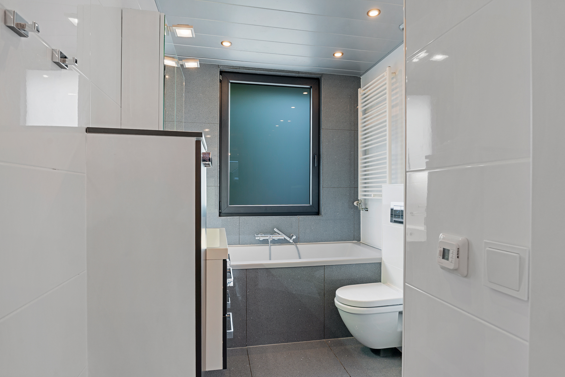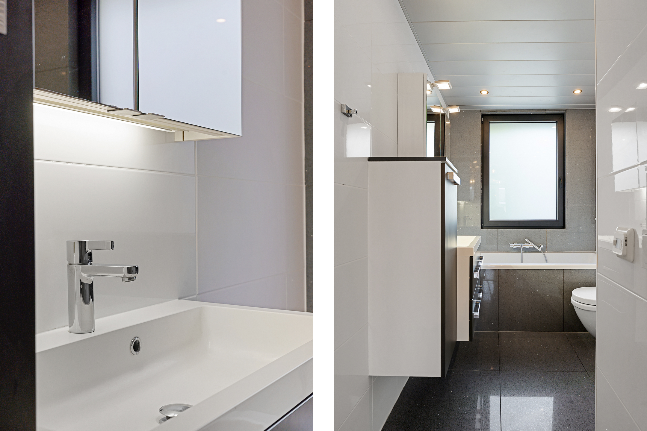 Via de overloop met laminaatvloer bereik je drie slaapkamers: één aan de voorzijde en twee aan de achterzijde. De luxe badkamer is afgewerkt met een ligbad, separaat toilet, handdoekradiator, wastafelmeubel, vloerverwarming en inbouwspots.