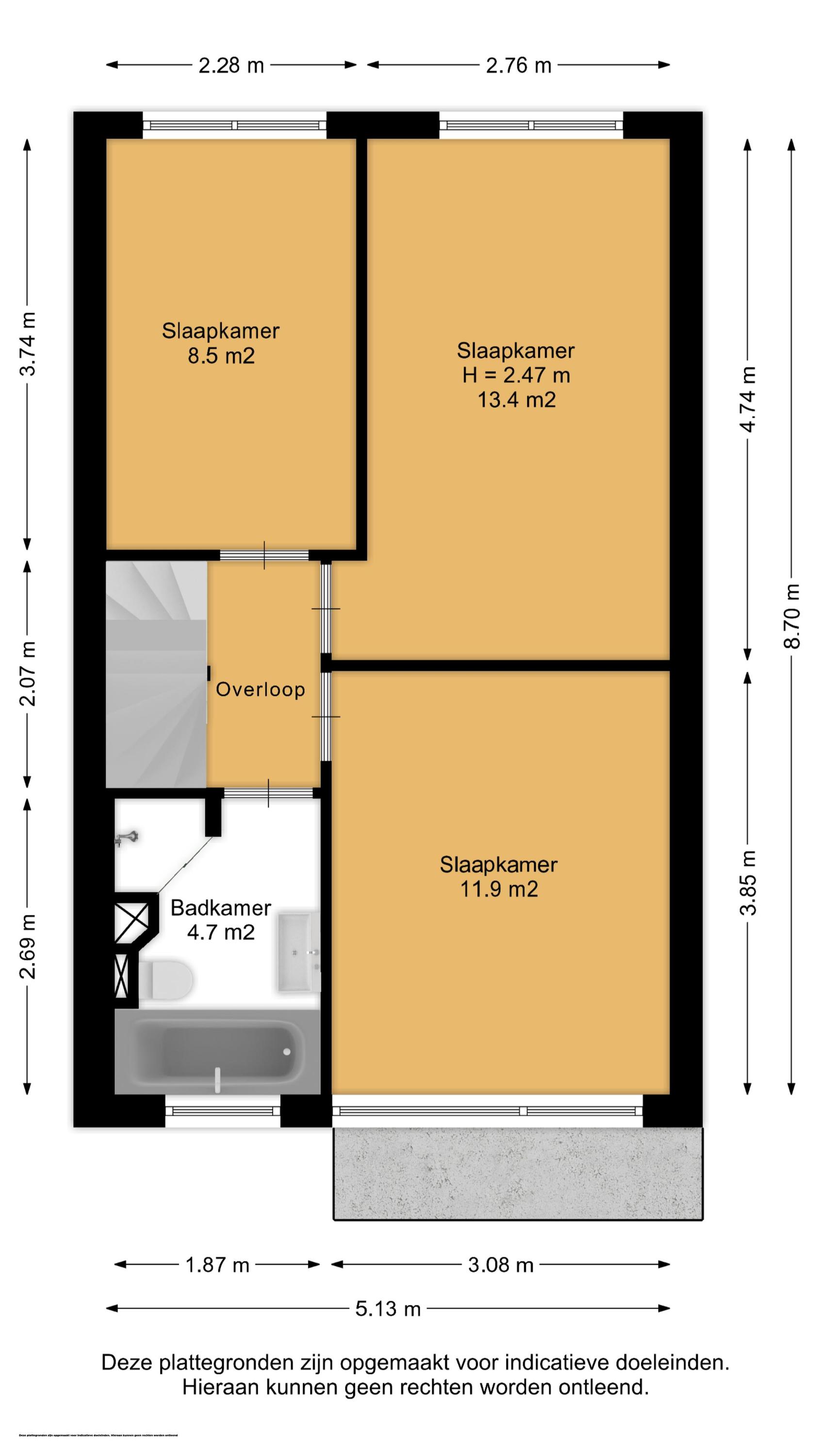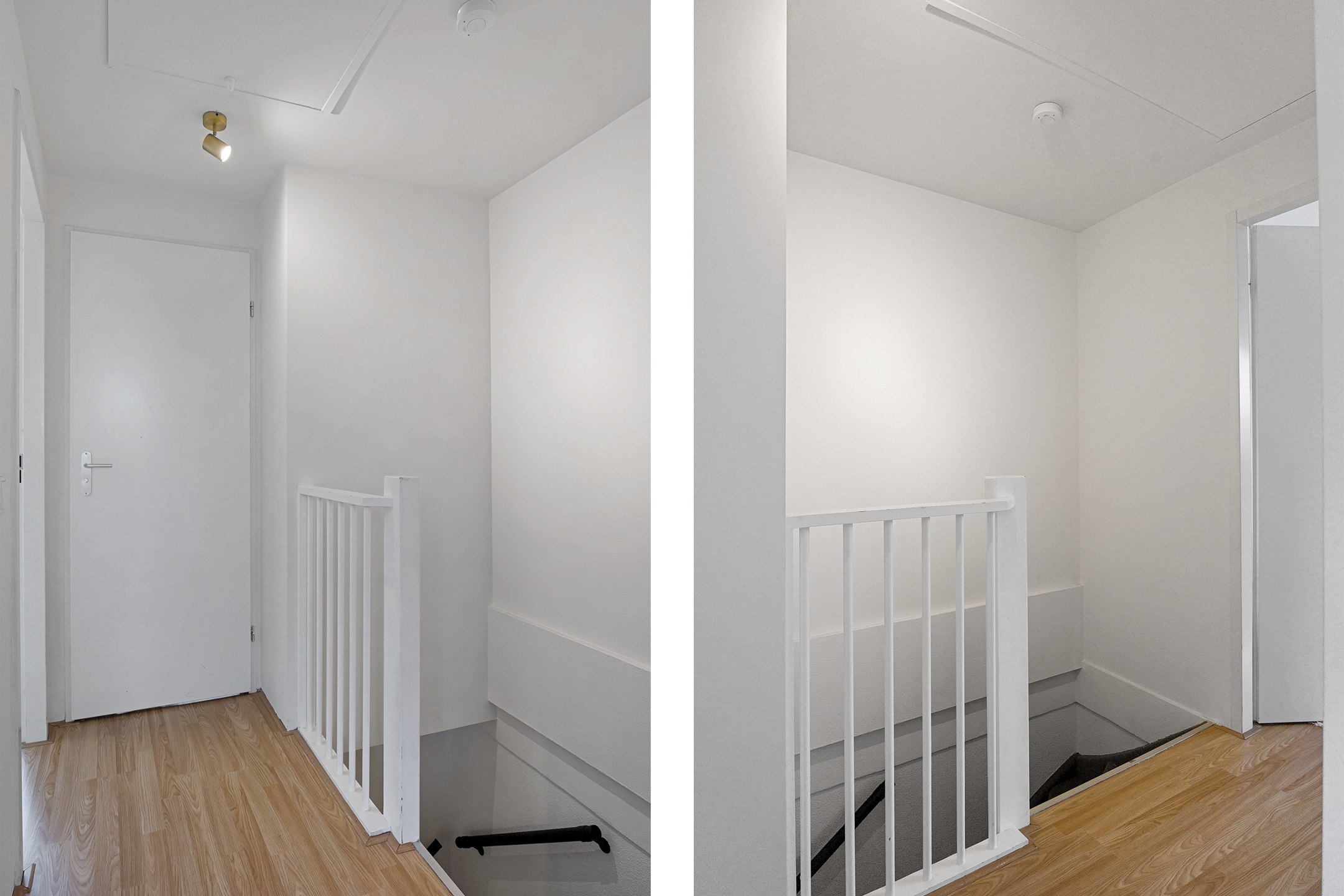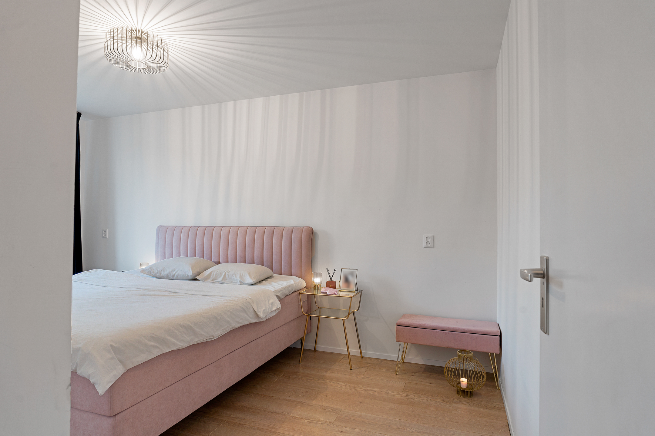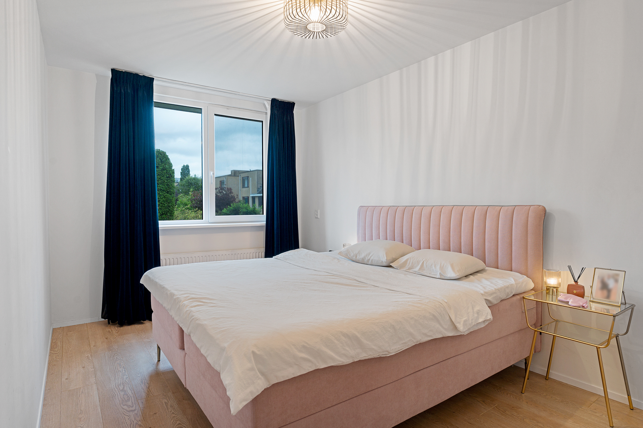 Via de overloop met laminaatvloer bereik je drie slaapkamers: één aan de voorzijde en twee aan de achterzijde. De luxe badkamer is afgewerkt met een ligbad, separaat toilet, handdoekradiator, wastafelmeubel, vloerverwarming en inbouwspots.