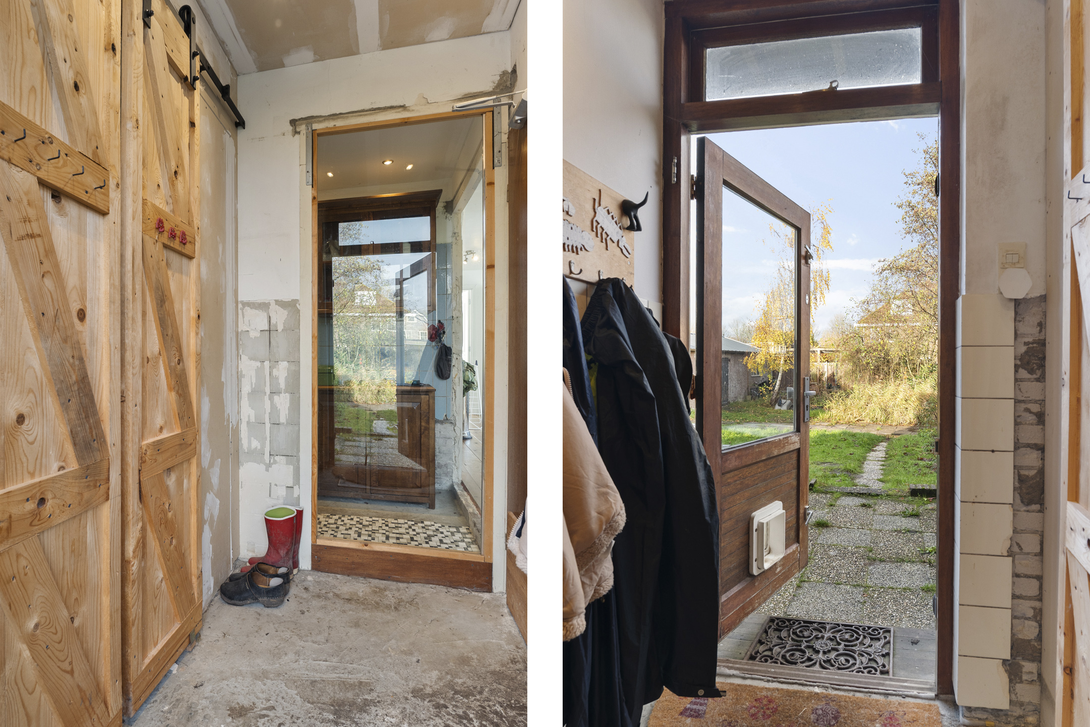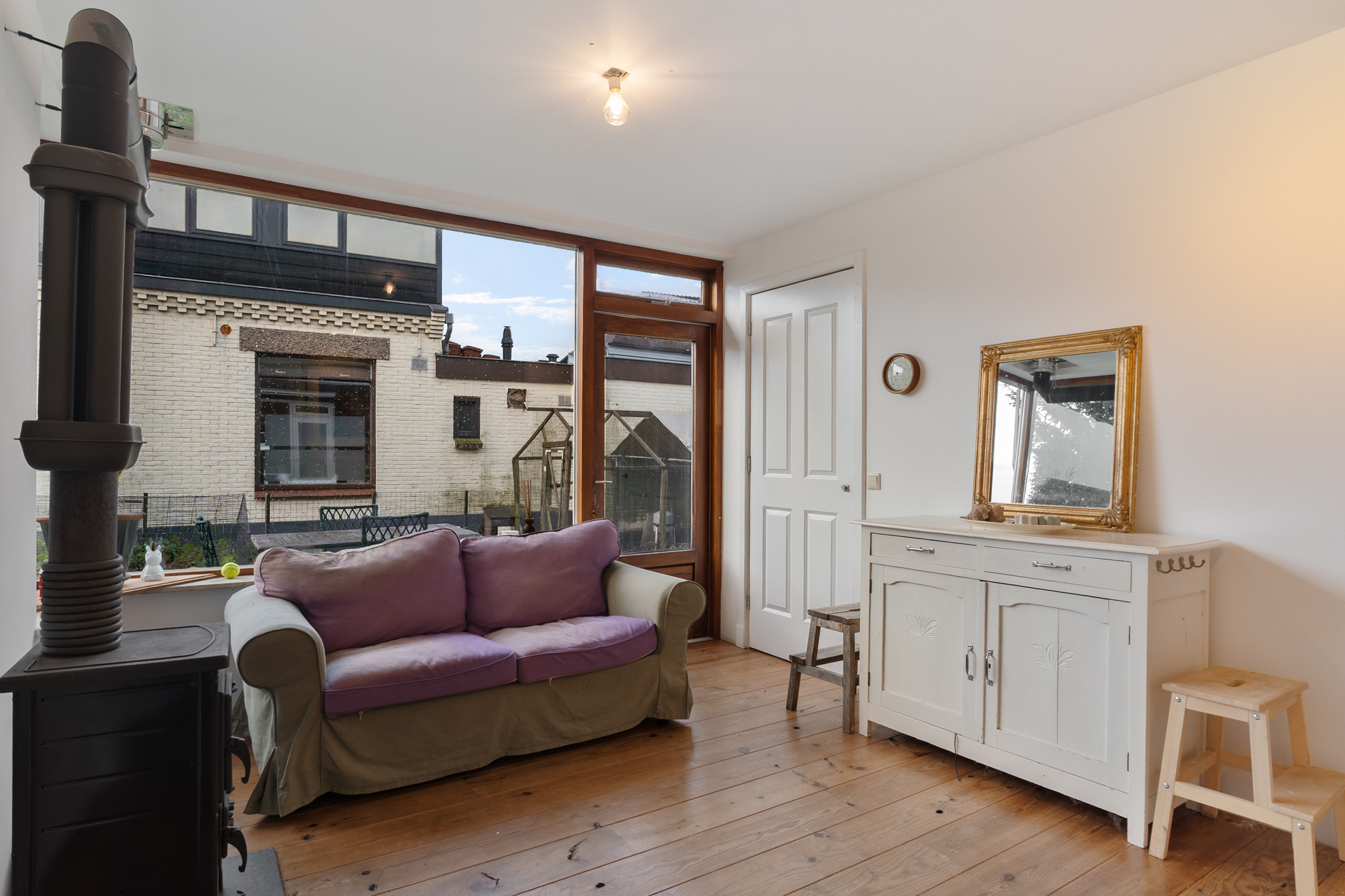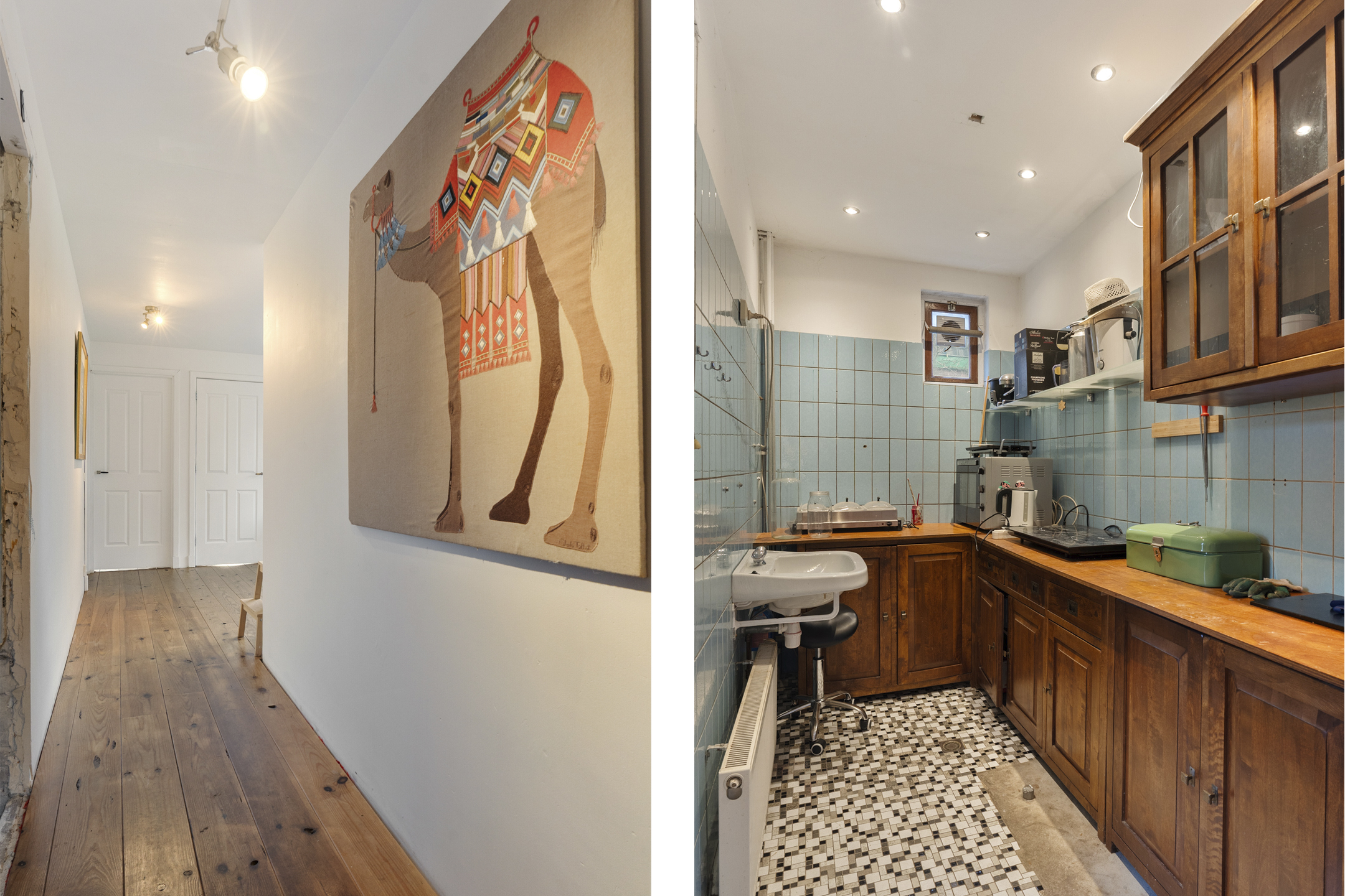 Aan de achterzijde is een eenvoudige keuken gerealiseerd in de voormalige badkamer, zonder inbouwapparatuur. Vanuit de achterhal bereik je de badkamer op de begane grond, voorzien van een wastafel, toilet, inloopdouche en opstelplaats voor de stookapparatuur.