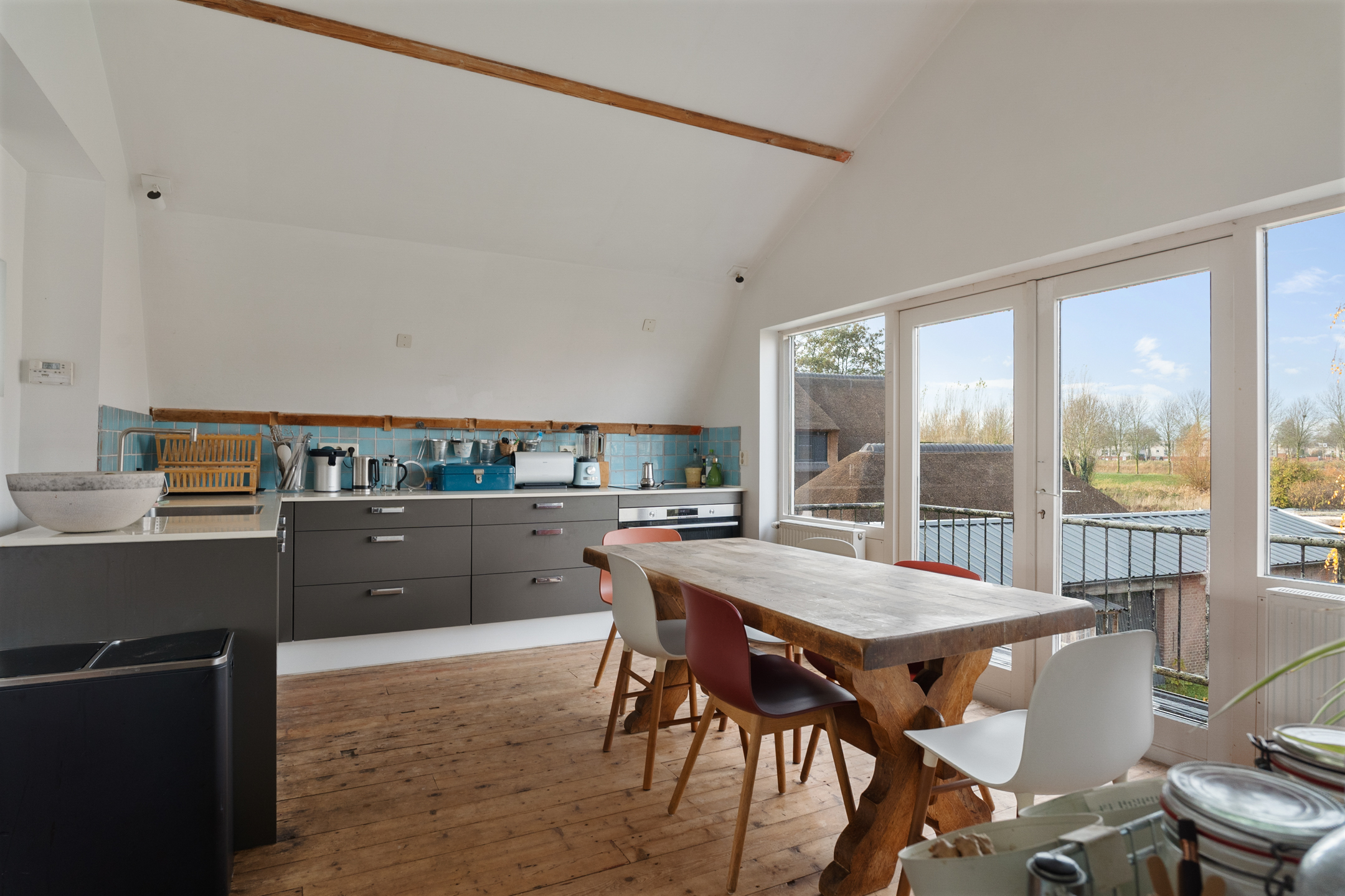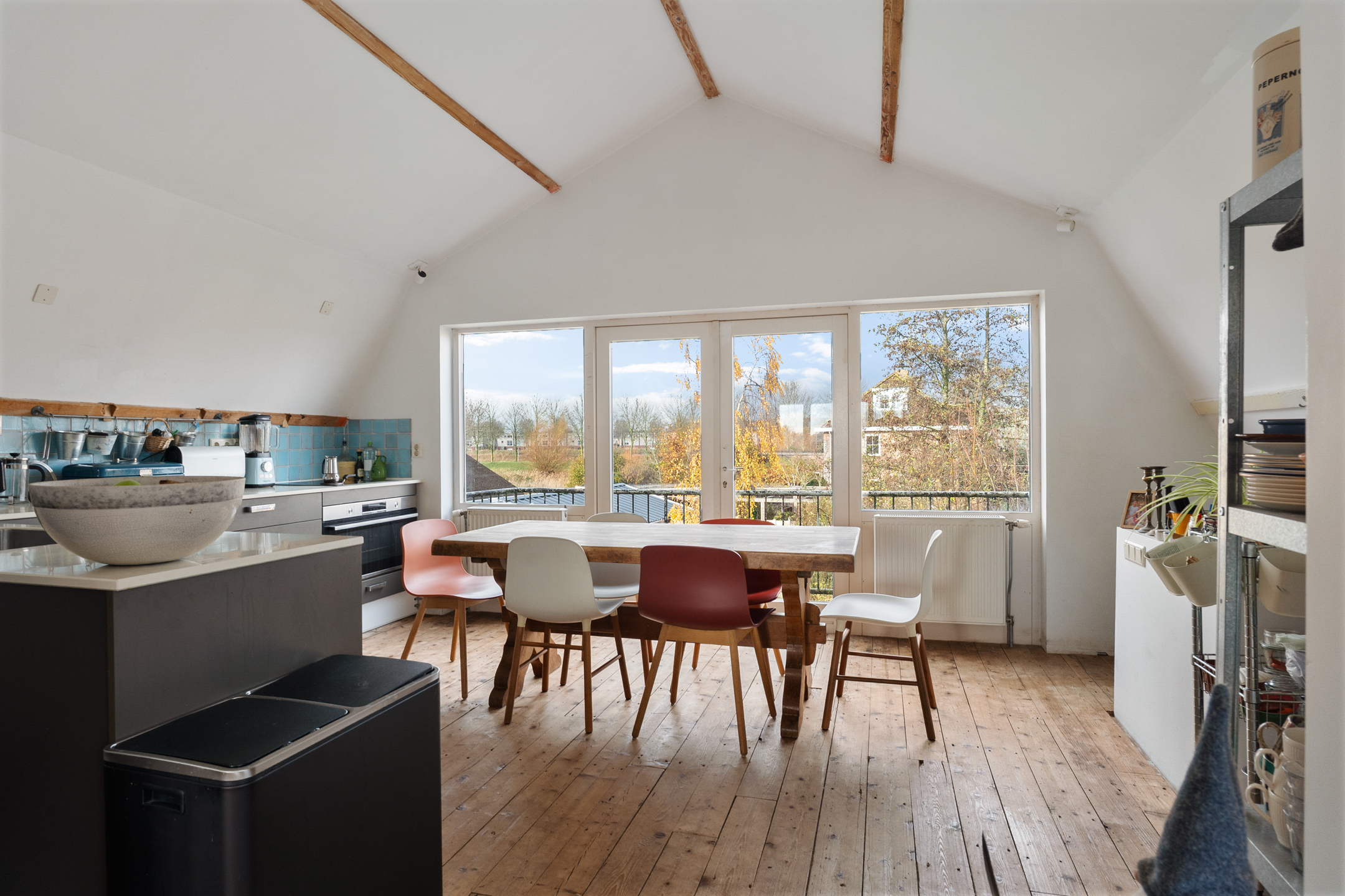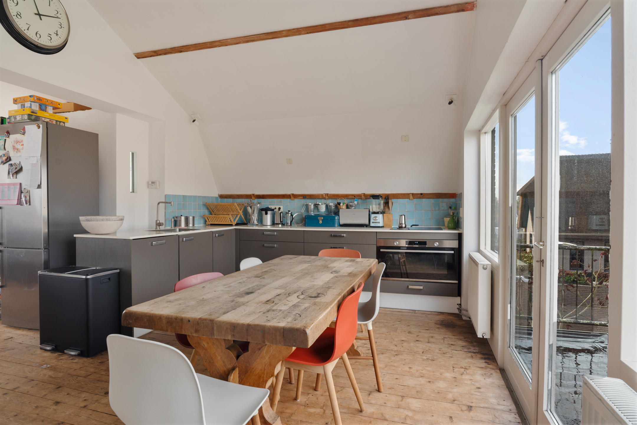 Aan de achterzijde ligt de open L-vormige keuken, uitgerust met onder andere een oven en inductiekookplaat. Via openslaande deuren bereik je het balkon aan de achterzijde – een fijne plek om van de rust en ruimte te genieten.