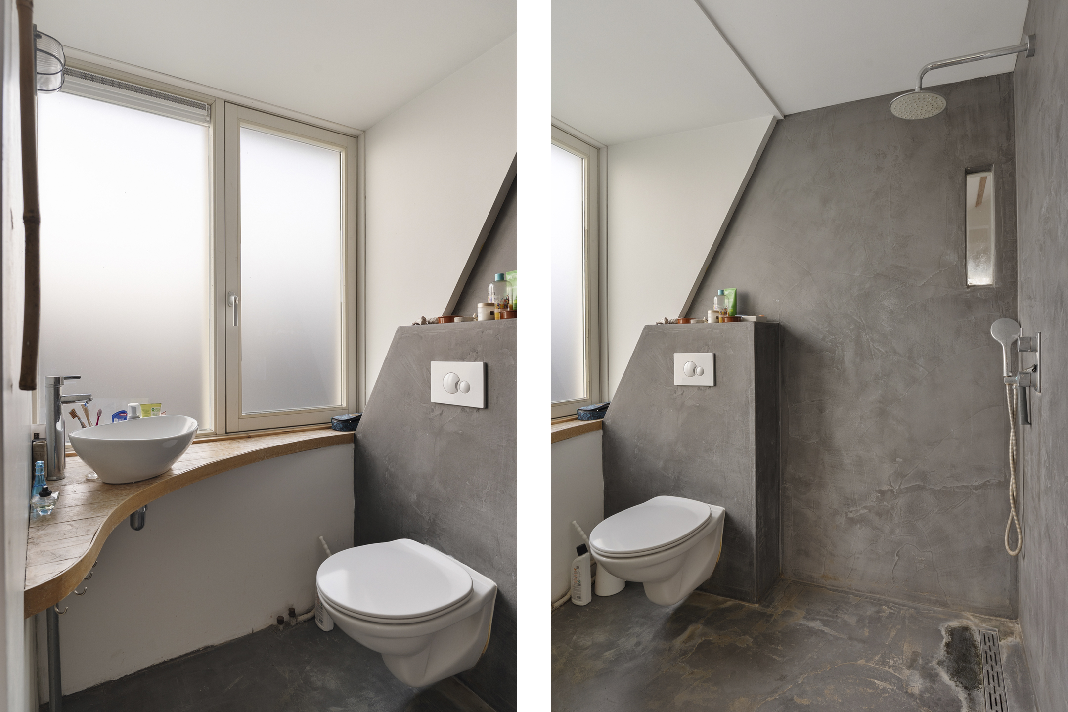 De badkamer, vernieuwd in 2018, is uitgevoerd in smaakvolle grijstinten en beschikt over een toilet en een ruime inloopdouche.