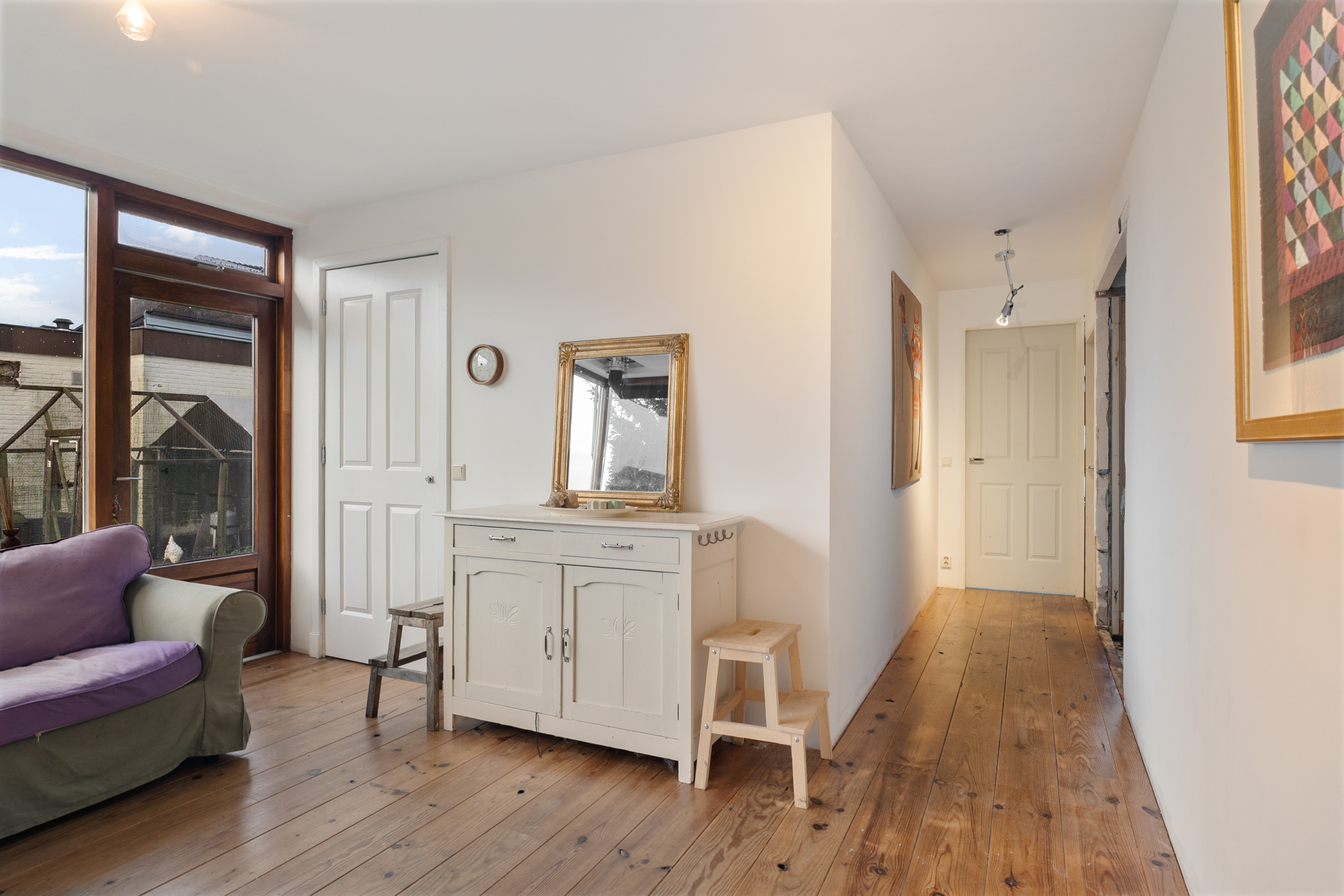 Entree aan de voorzijde met hal, meterkast en trapopgang naar de eerste verdieping. Op de begane grond bevindt zich een woonkamer met gezellige houtkachel en vaste bergkast, met toegang tot de zijtuin.