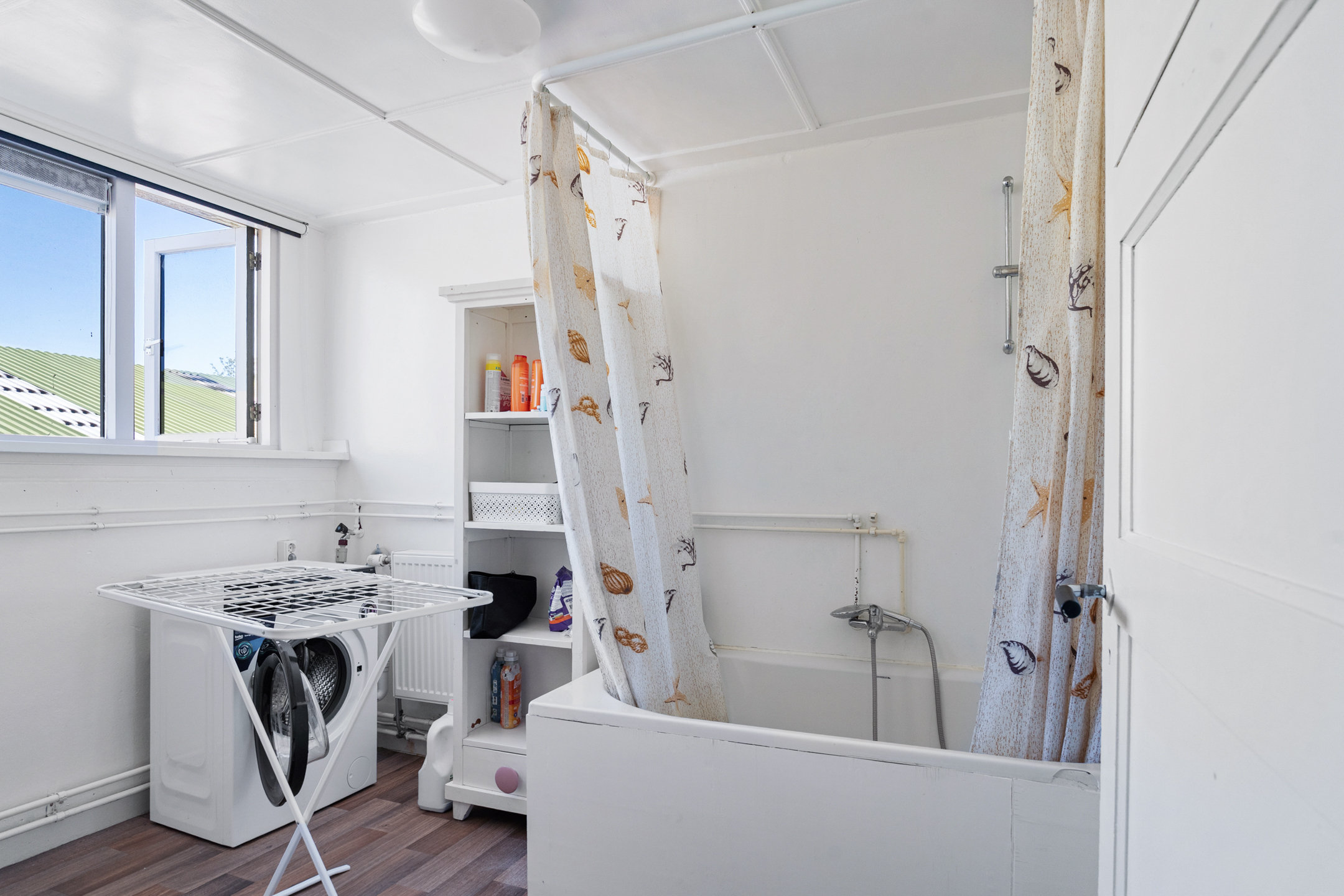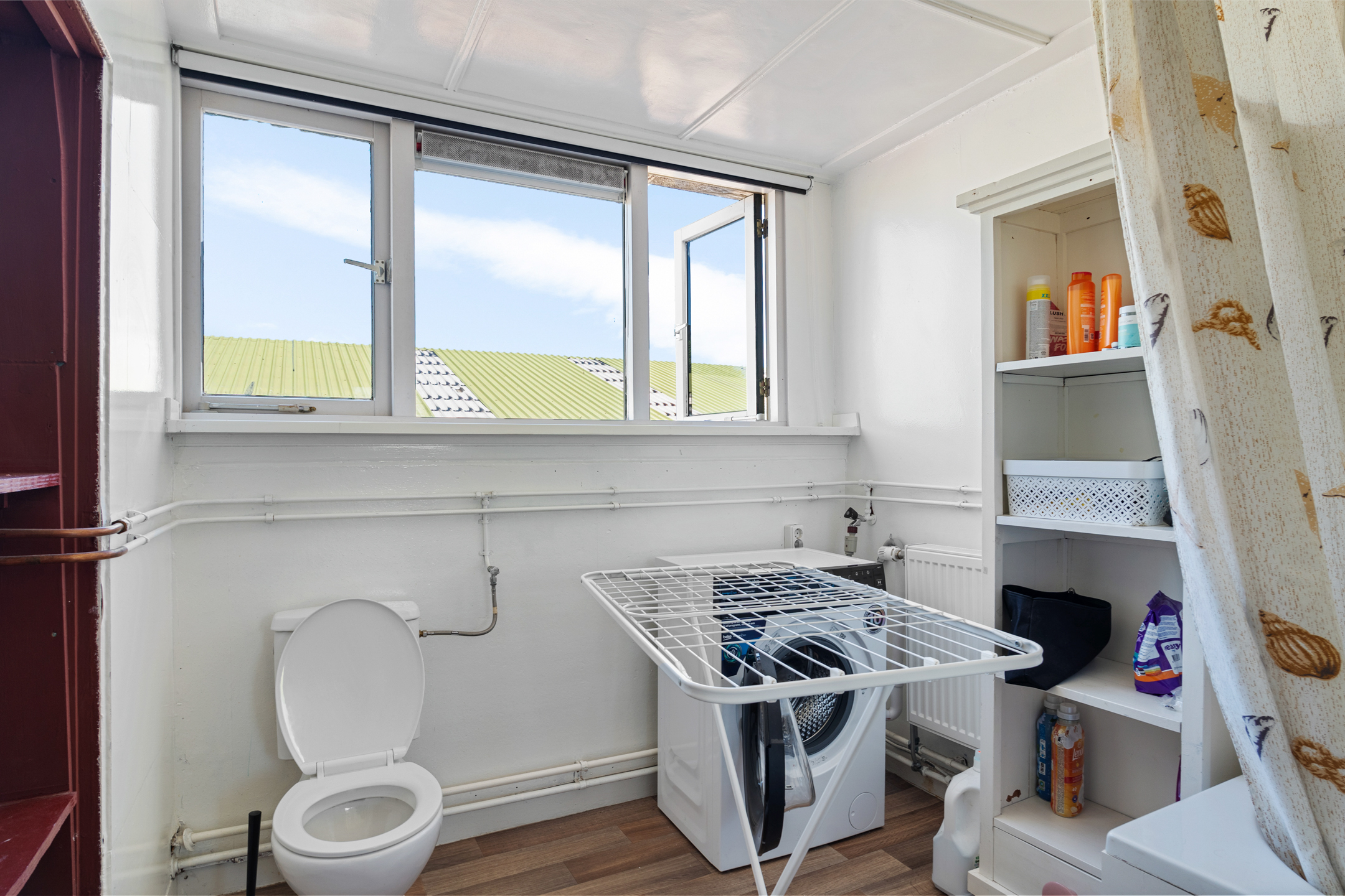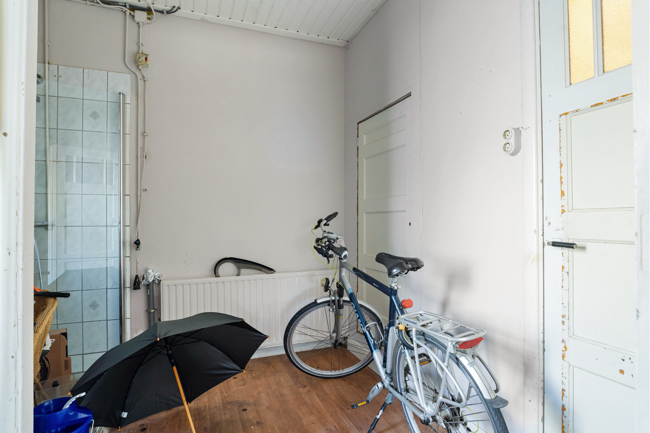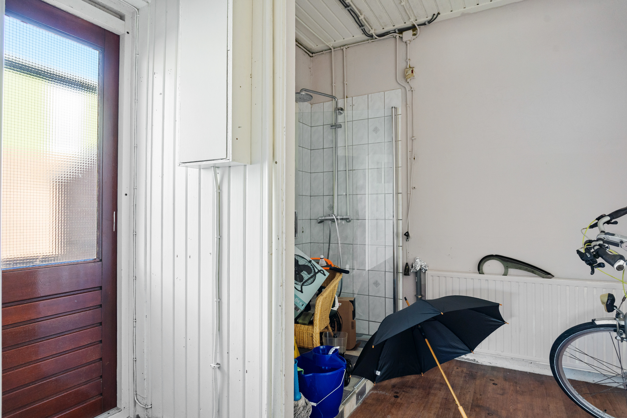 Vanuit de keuken is er toegang tot de bijkeuken, die ook bereikbaar is via de woonkamer én via buiten. In de bijkeuken vind je een douchecabine, praktisch als tweede sanitaire ruimte.