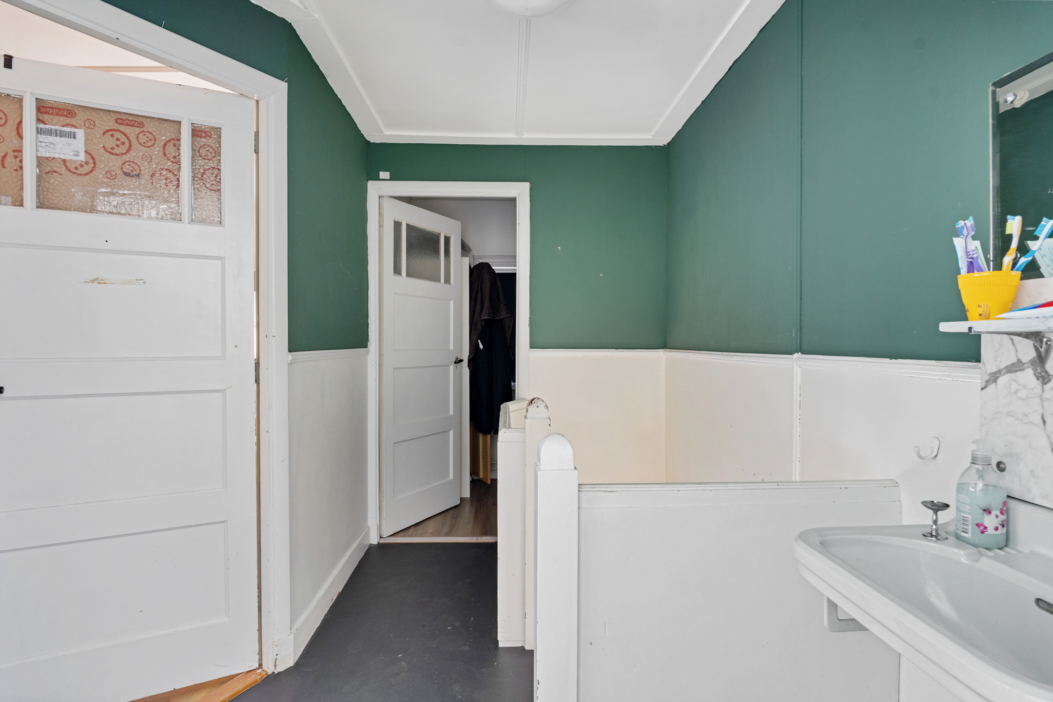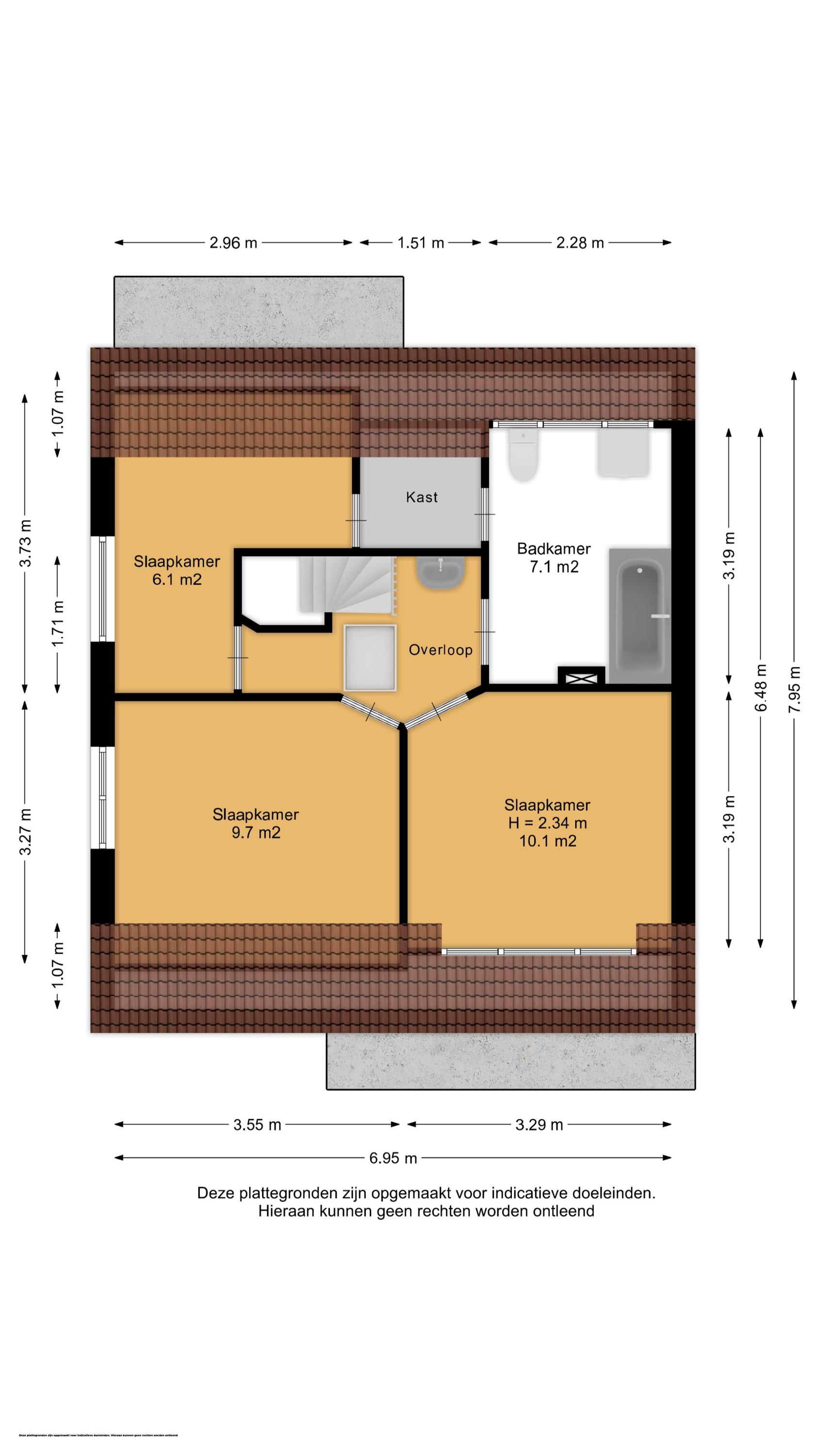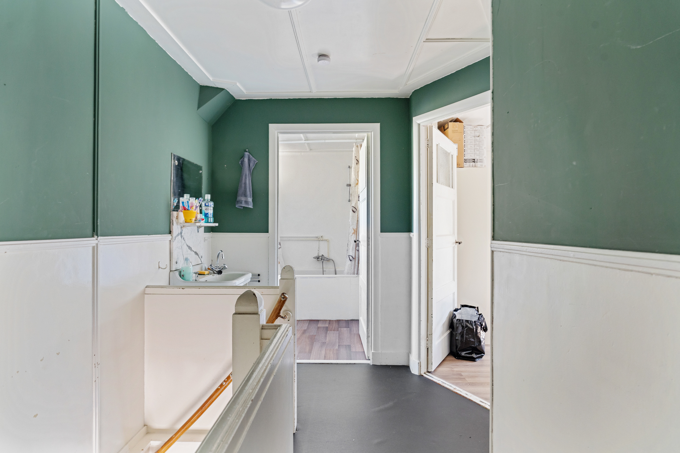 Via de overloop, waar zich ook een wastafel bevindt, heb je toegang tot drie slaapkamers. Twee liggen aan de voorzijde en één aan de achterzijde, goed te gebruiken als werk- of hobbyruimte. Vanuit deze achterste kamer bereik je via een inloopkast de badkamer, die is voorzien van een ligbad met douche, tweede toilet en aansluitingen voor wasmachine en droger.