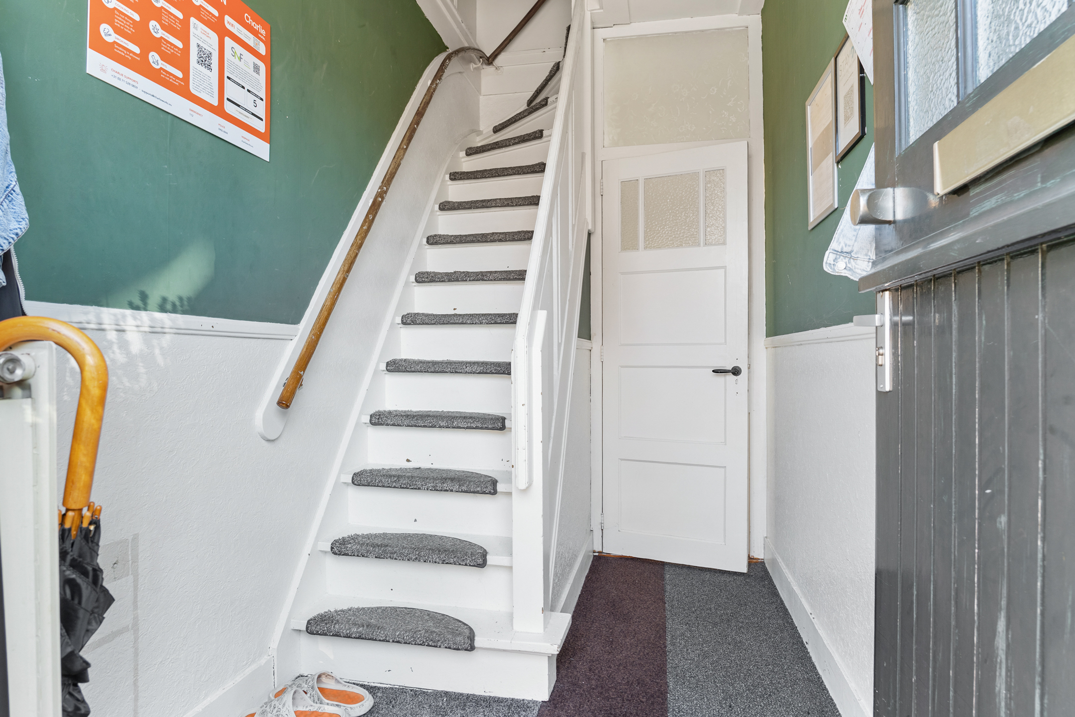 De entree bevindt zich aan de zijkant van de woning. Bij binnenkomst kom je in de hal die toegang geeft tot het toilet, de trap naar boven en de overige vertrekken.