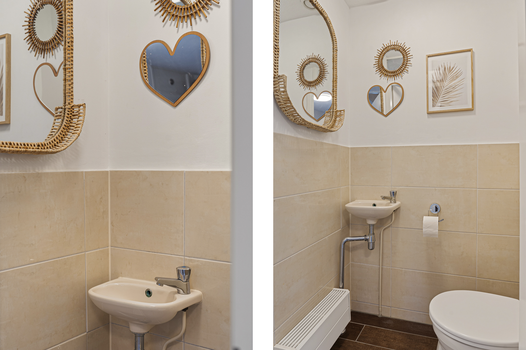 Daarnaast is er een separaat toilet op de overloop aanwezig, wel zo prettig met meerdere personen in huis. In de aparte wasruimte vind je de mechanische ventilatie-unit en de aansluitingen voor wasmachine en droger, netjes uit het zicht en praktisch gescheiden van de overige ruimtes.