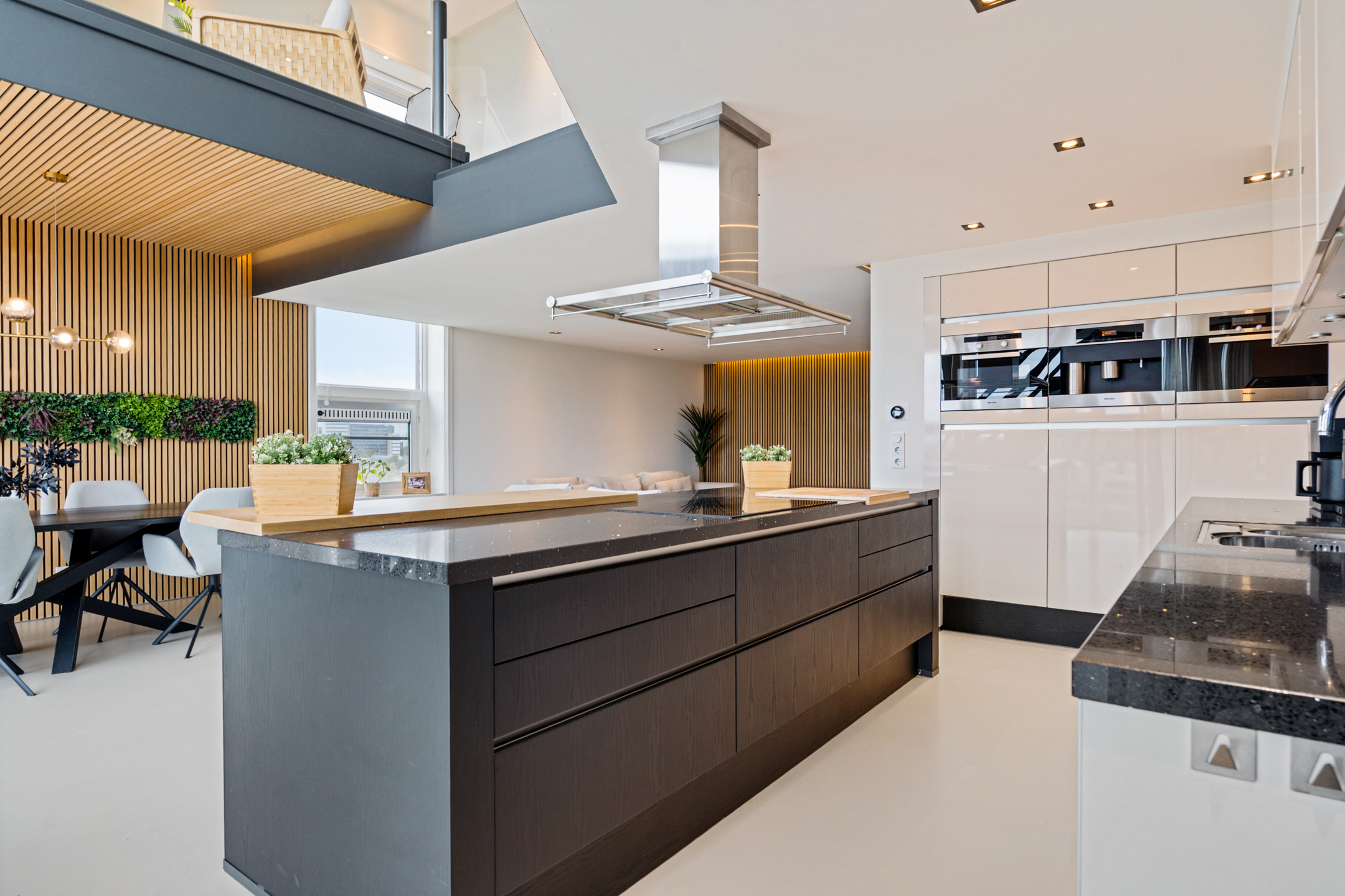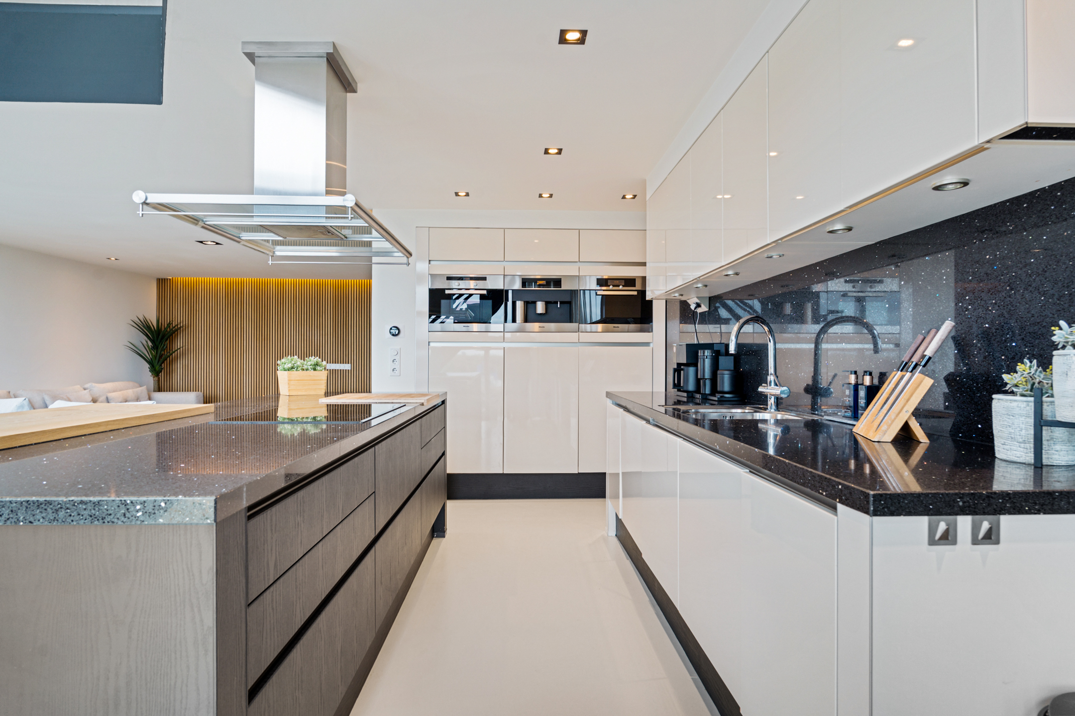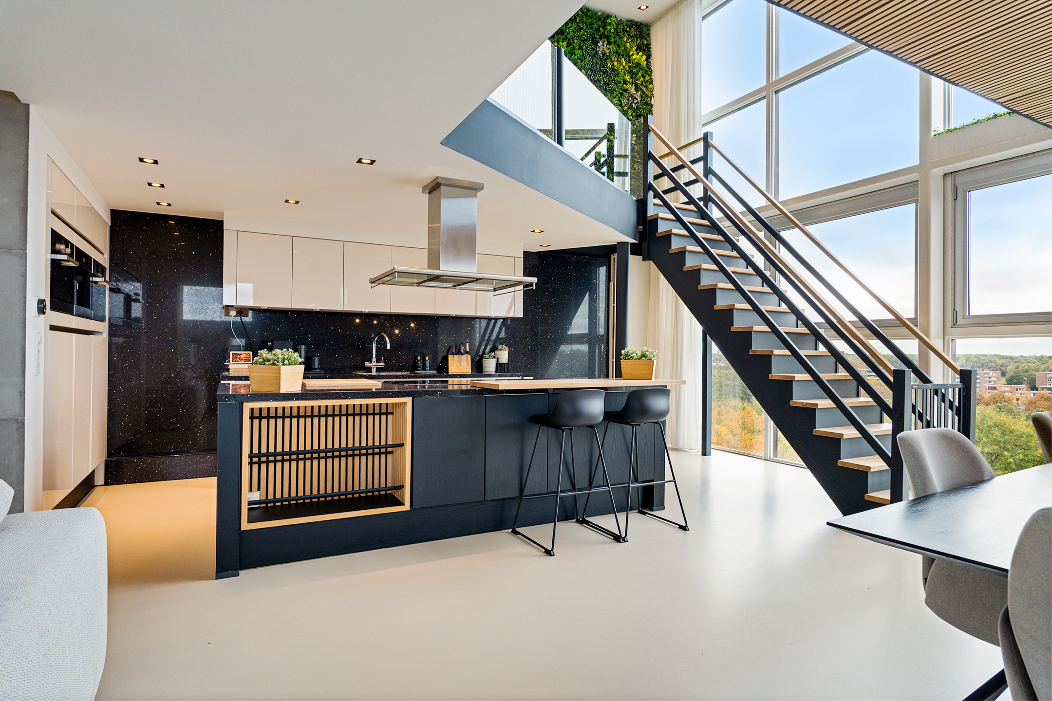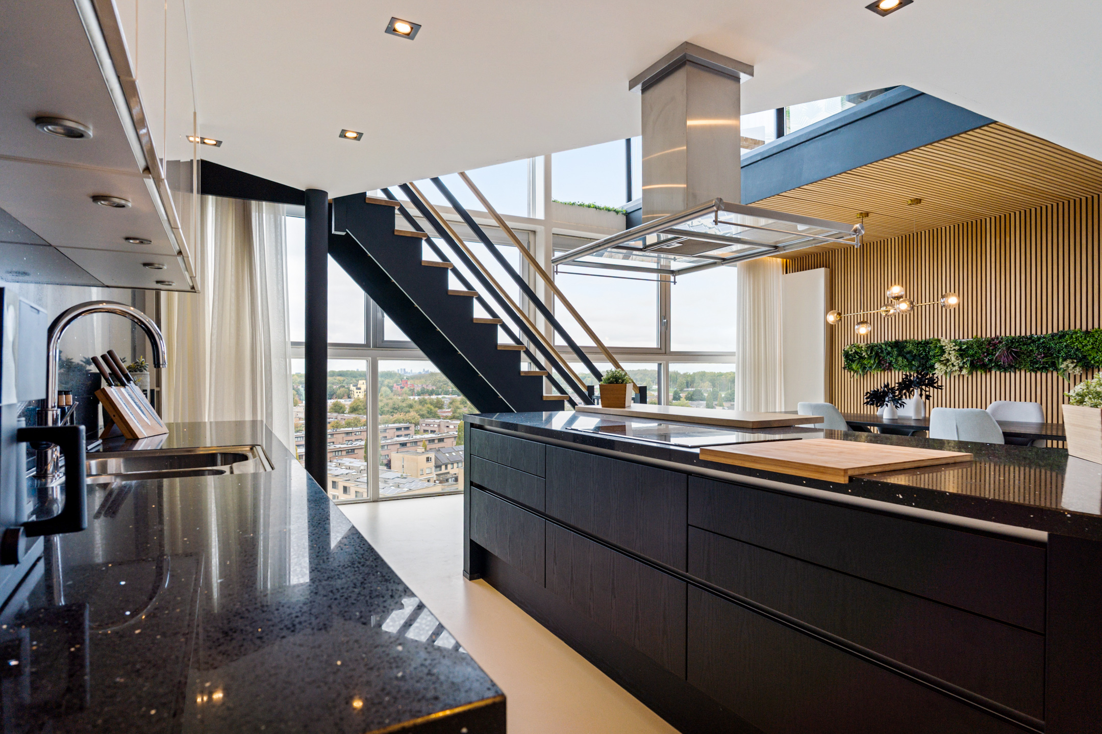 Daarna opent de woning zich in volle glorie. De leefruimte strekt zich voor je uit met een plafondhoge glazen pui die het uitzicht tot leven brengt. De keuken is hier het hart van het huis – een modern statement met een groot kookeiland, granieten werkblad en hoogwaardige inbouwapparatuur. De subtiele herhaling van de houten wandpanelen in het kookeiland creëert een prachtig geheel.