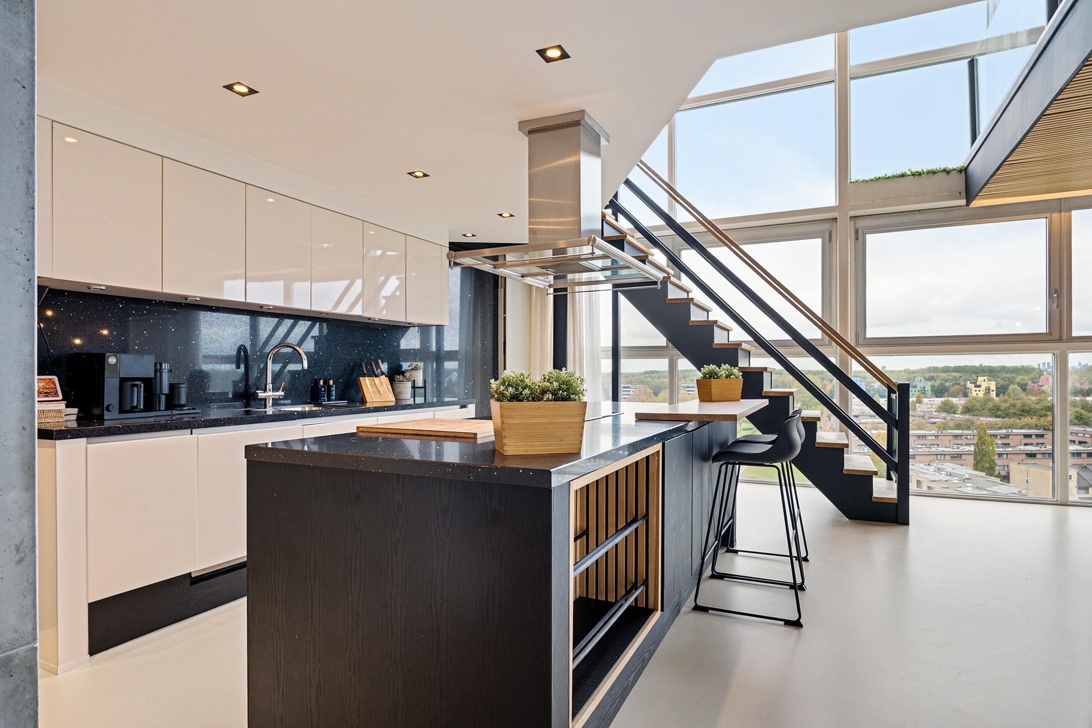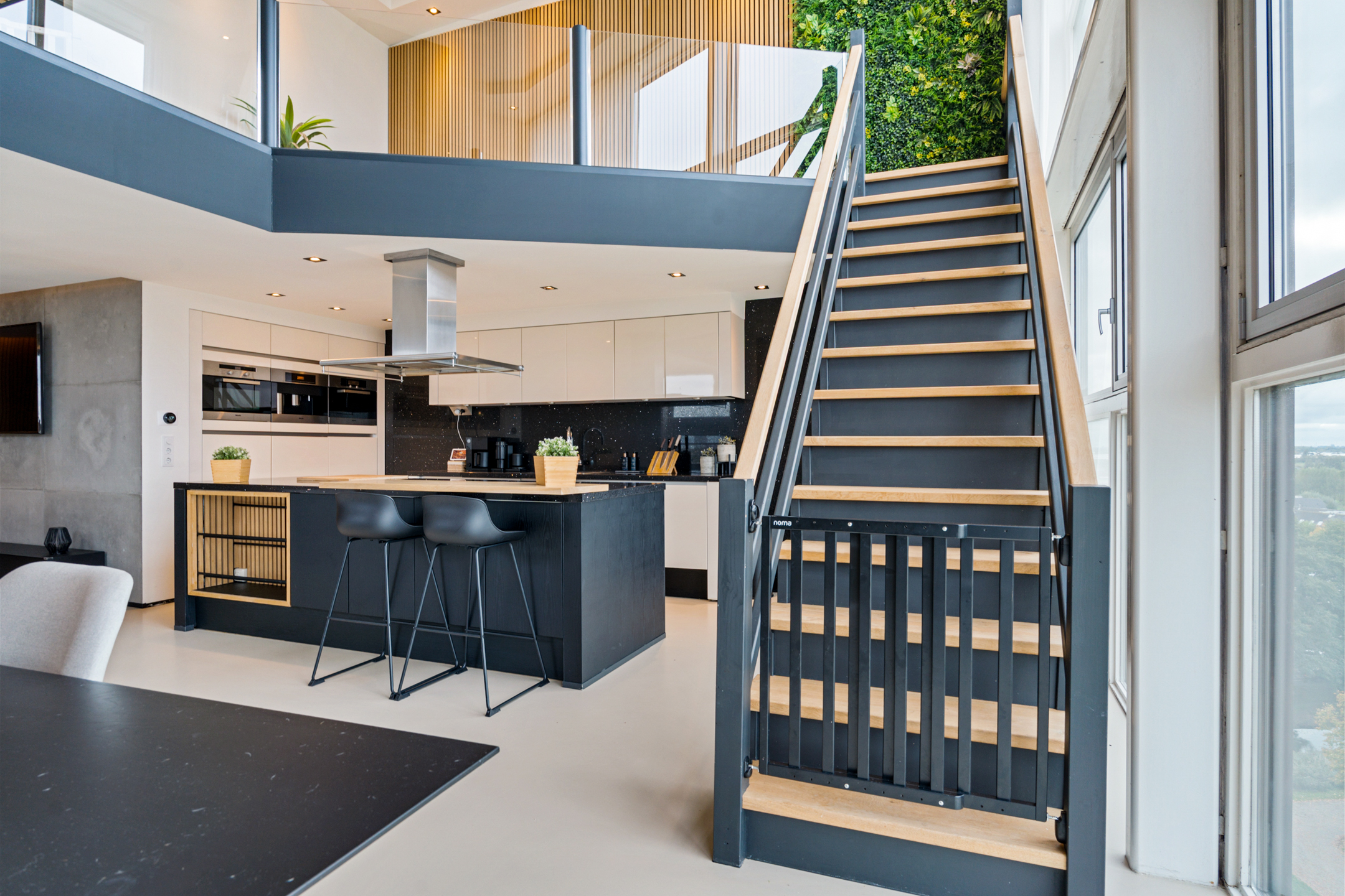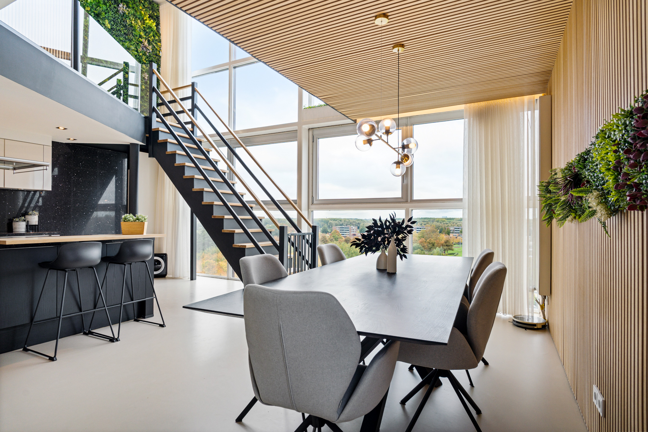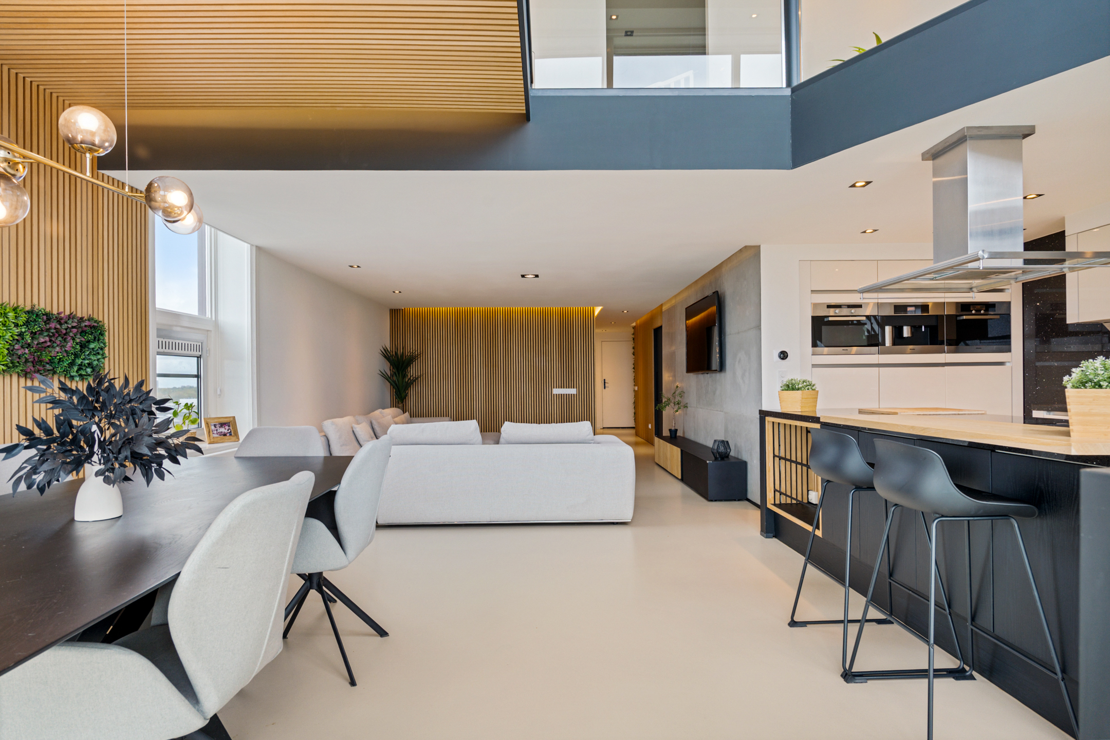 Daarna opent de woning zich in volle glorie. De leefruimte strekt zich voor je uit met een plafondhoge glazen pui die het uitzicht tot leven brengt. De keuken is hier het hart van het huis – een modern statement met een groot kookeiland, granieten werkblad en hoogwaardige inbouwapparatuur. De subtiele herhaling van de houten wandpanelen in het kookeiland creëert een prachtig geheel.