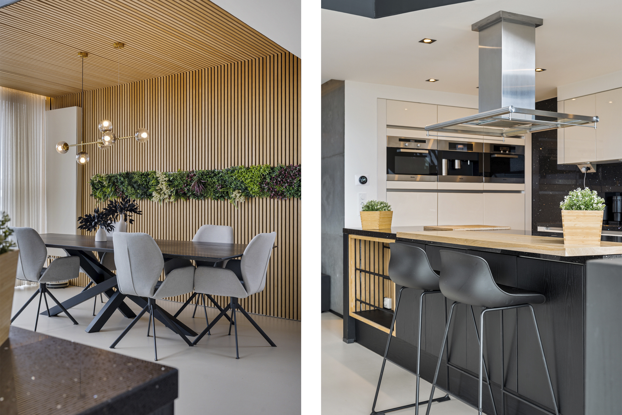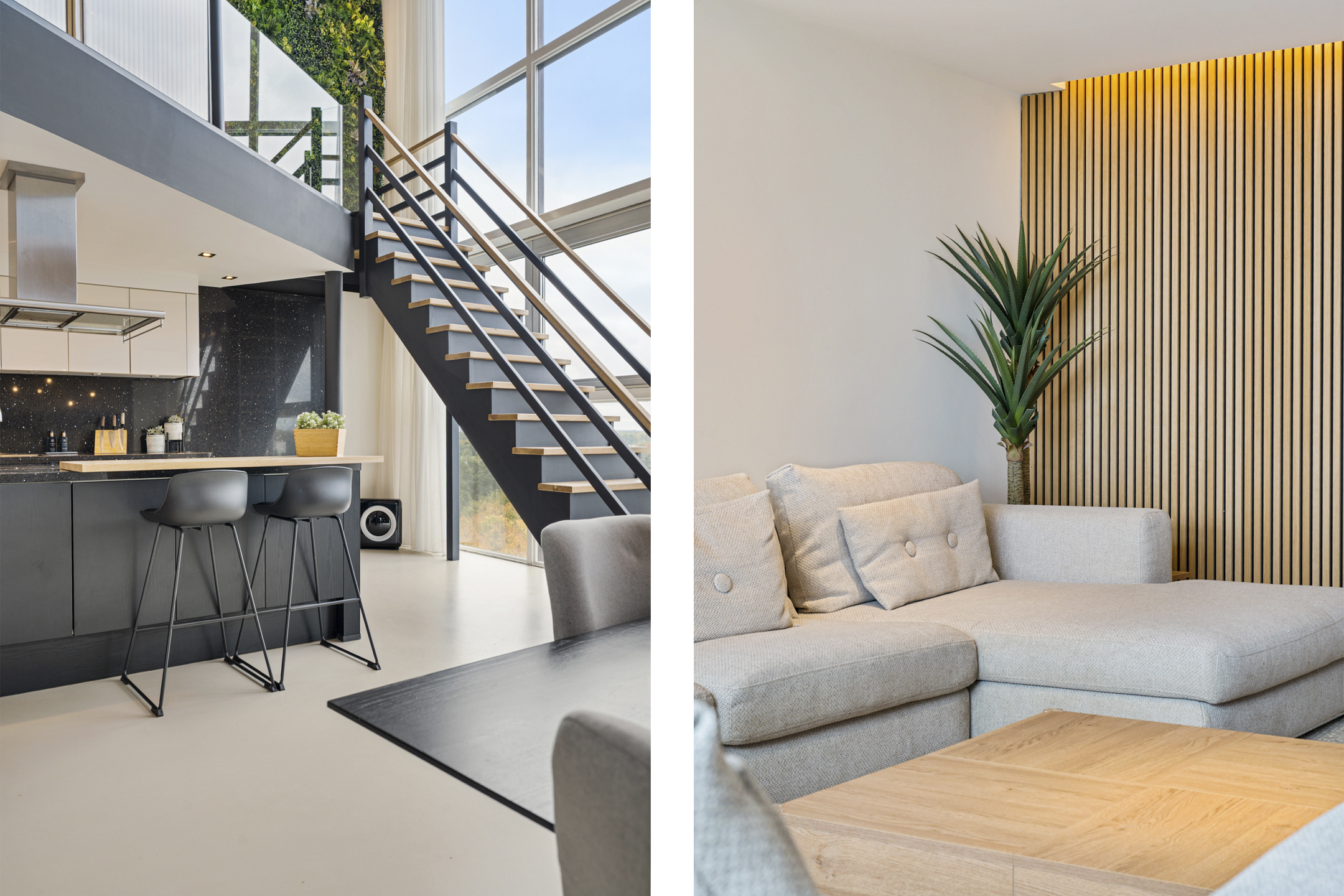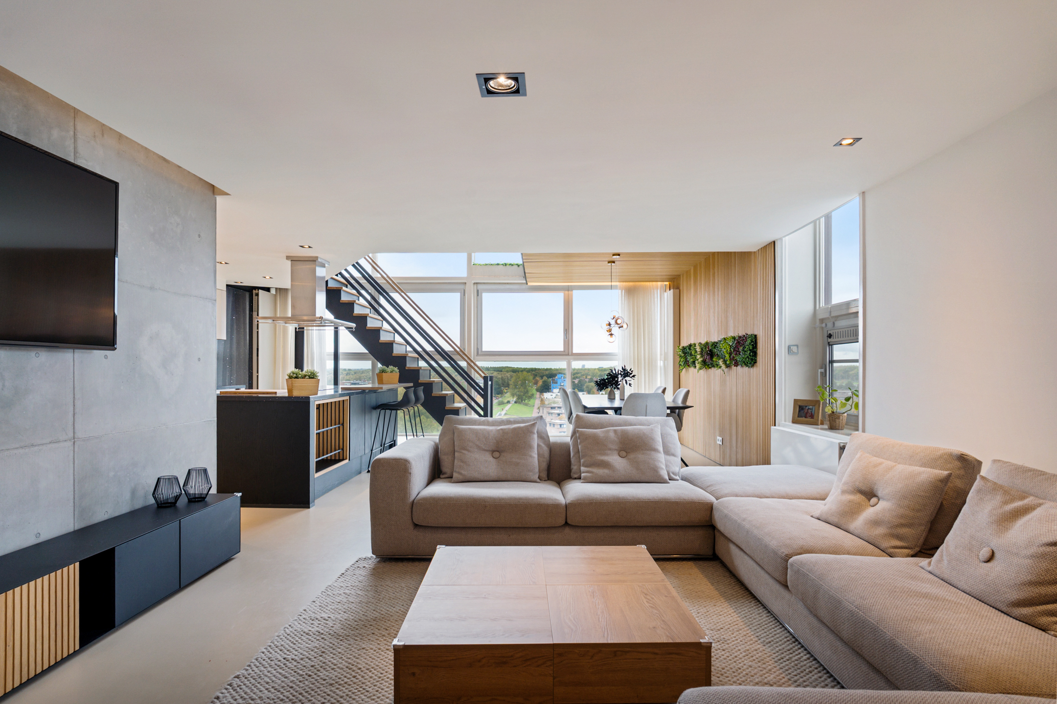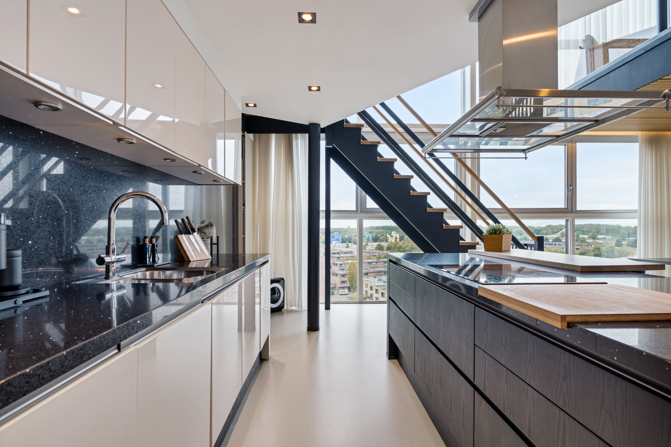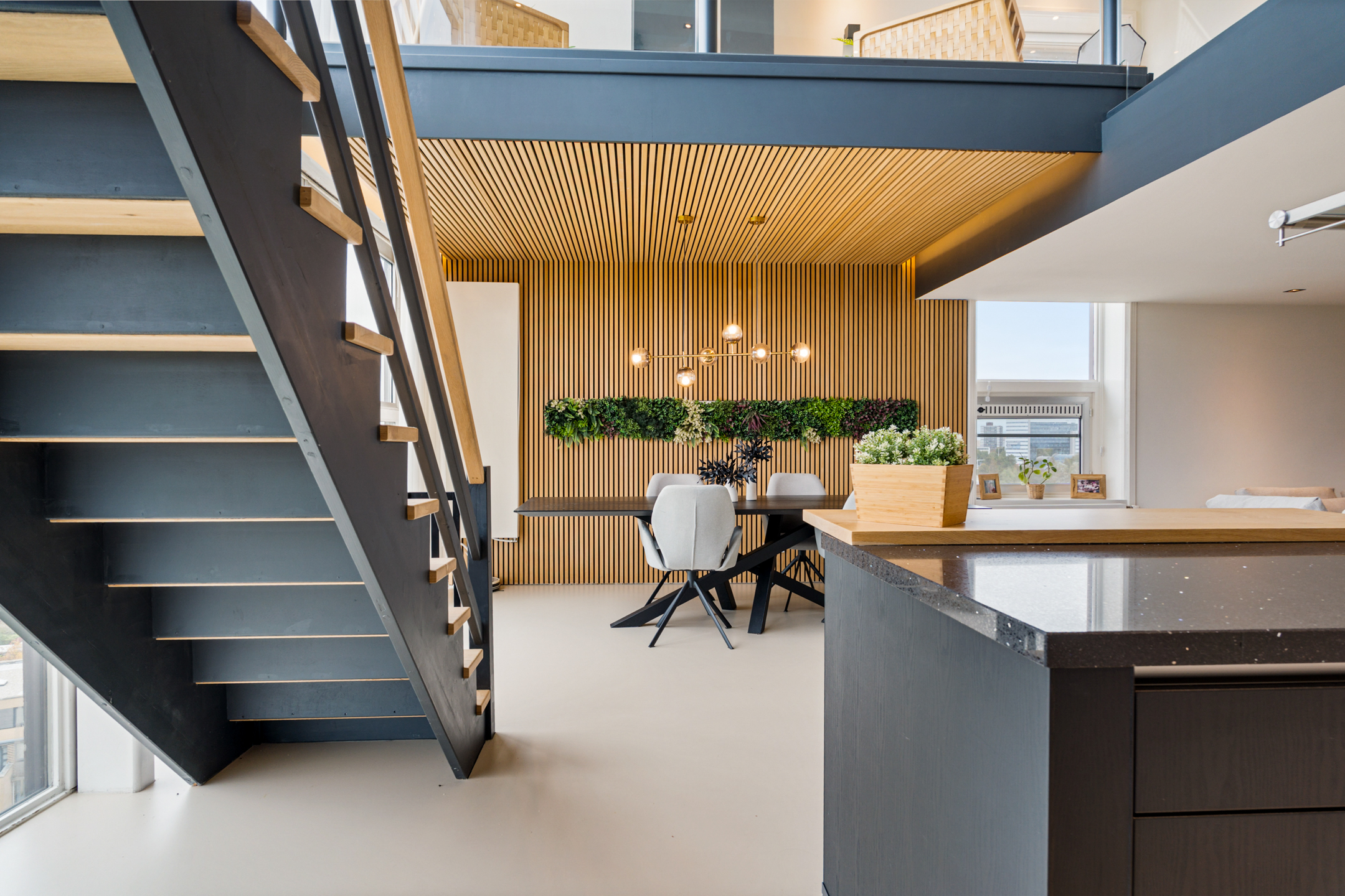 Daarna opent de woning zich in volle glorie. De leefruimte strekt zich voor je uit met een plafondhoge glazen pui die het uitzicht tot leven brengt. De keuken is hier het hart van het huis – een modern statement met een groot kookeiland, granieten werkblad en hoogwaardige inbouwapparatuur. De subtiele herhaling van de houten wandpanelen in het kookeiland creëert een prachtig geheel.