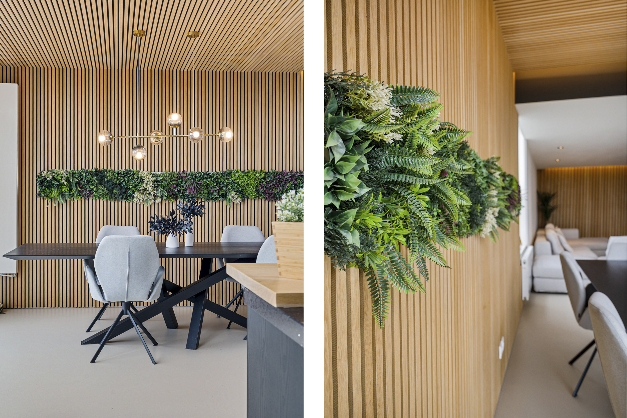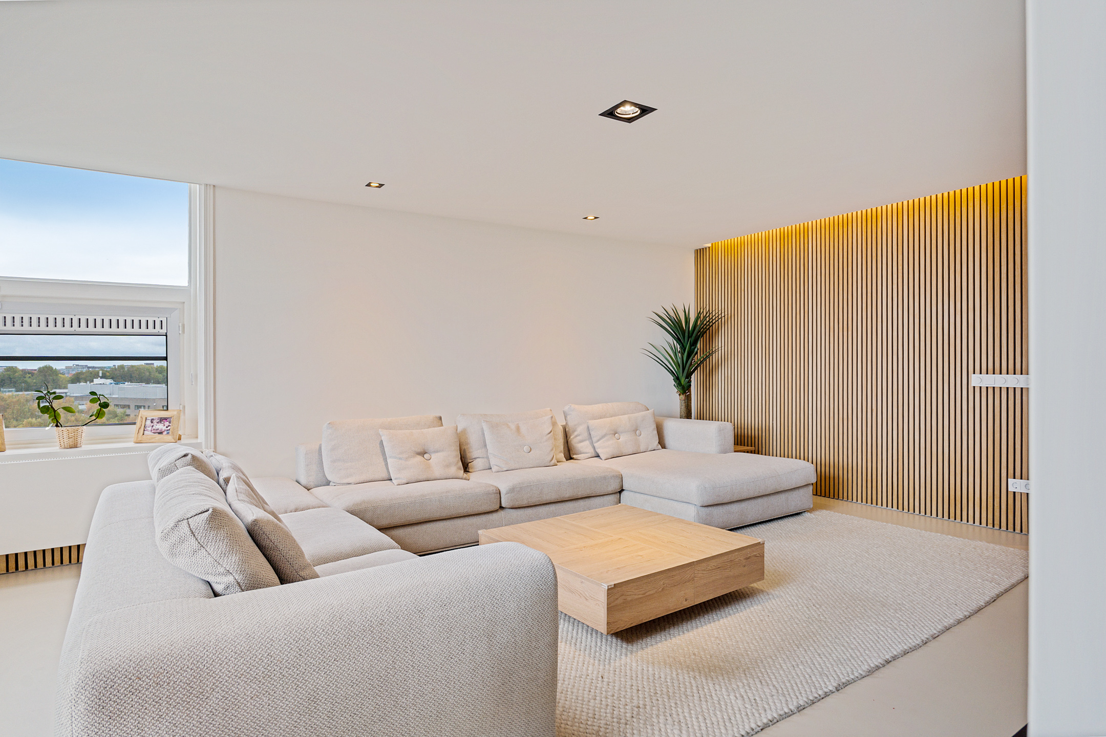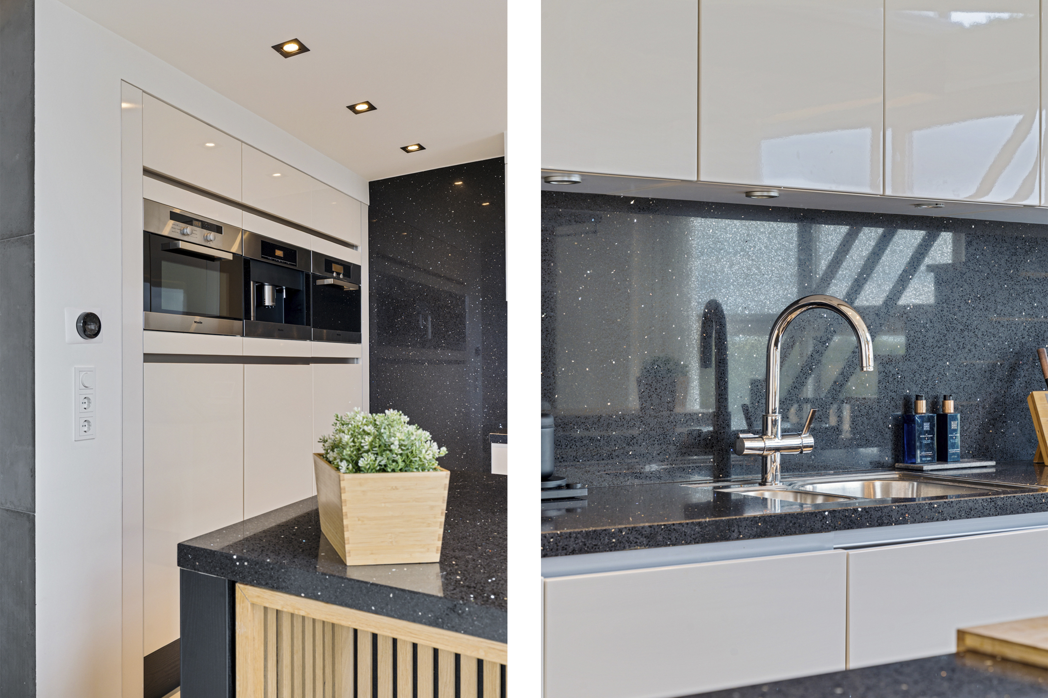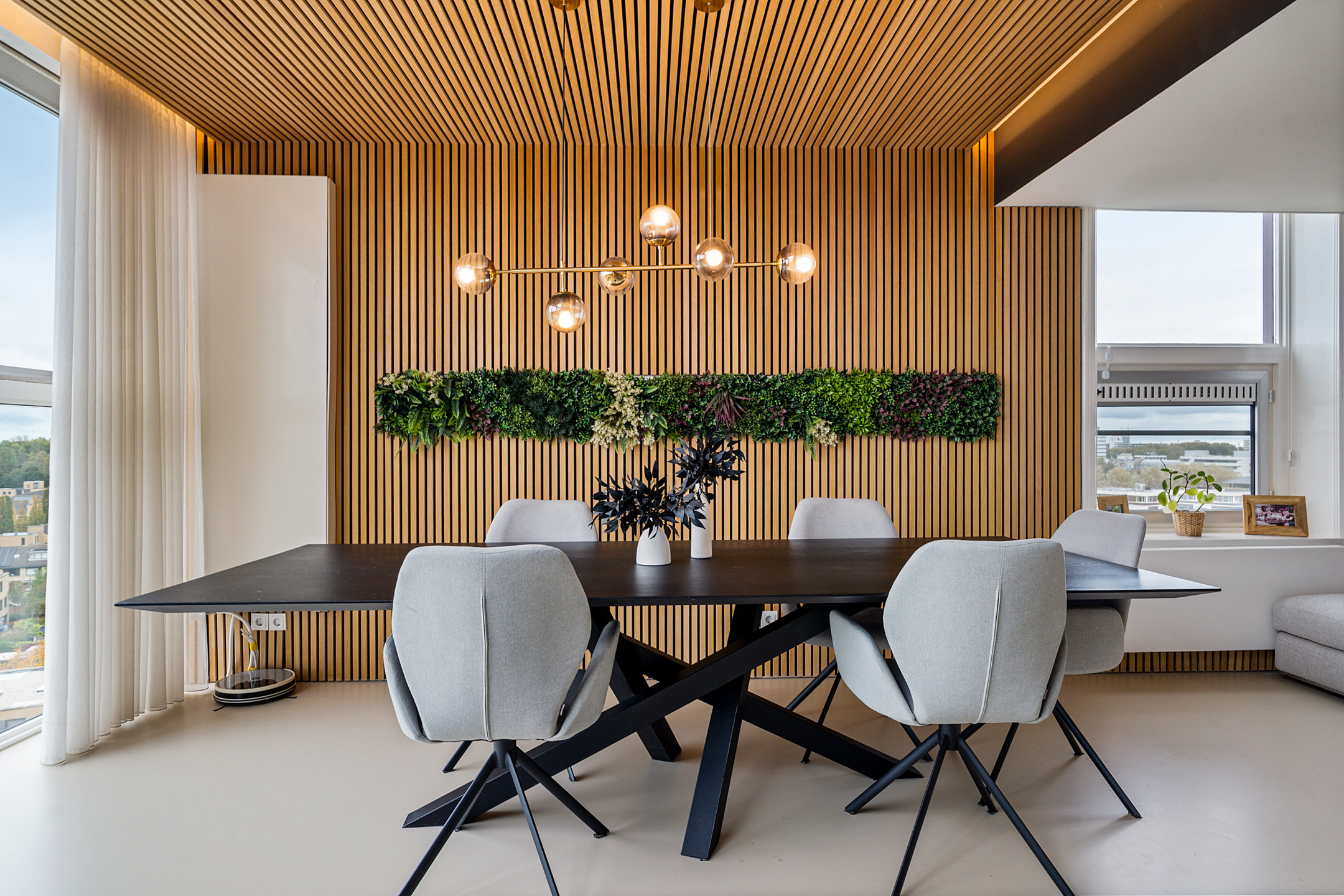 Daarna opent de woning zich in volle glorie. De leefruimte strekt zich voor je uit met een plafondhoge glazen pui die het uitzicht tot leven brengt. De keuken is hier het hart van het huis – een modern statement met een groot kookeiland, granieten werkblad en hoogwaardige inbouwapparatuur. De subtiele herhaling van de houten wandpanelen in het kookeiland creëert een prachtig geheel.
