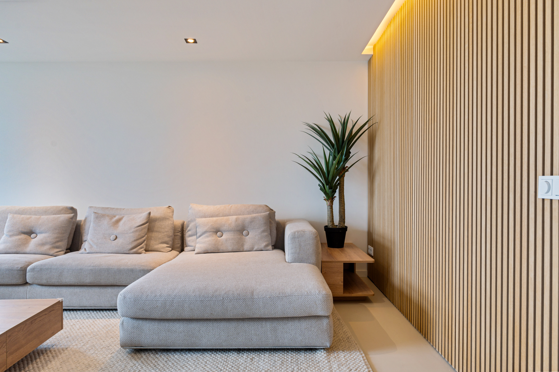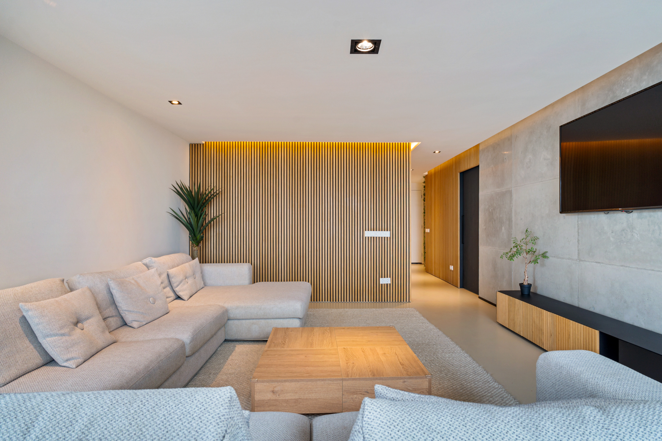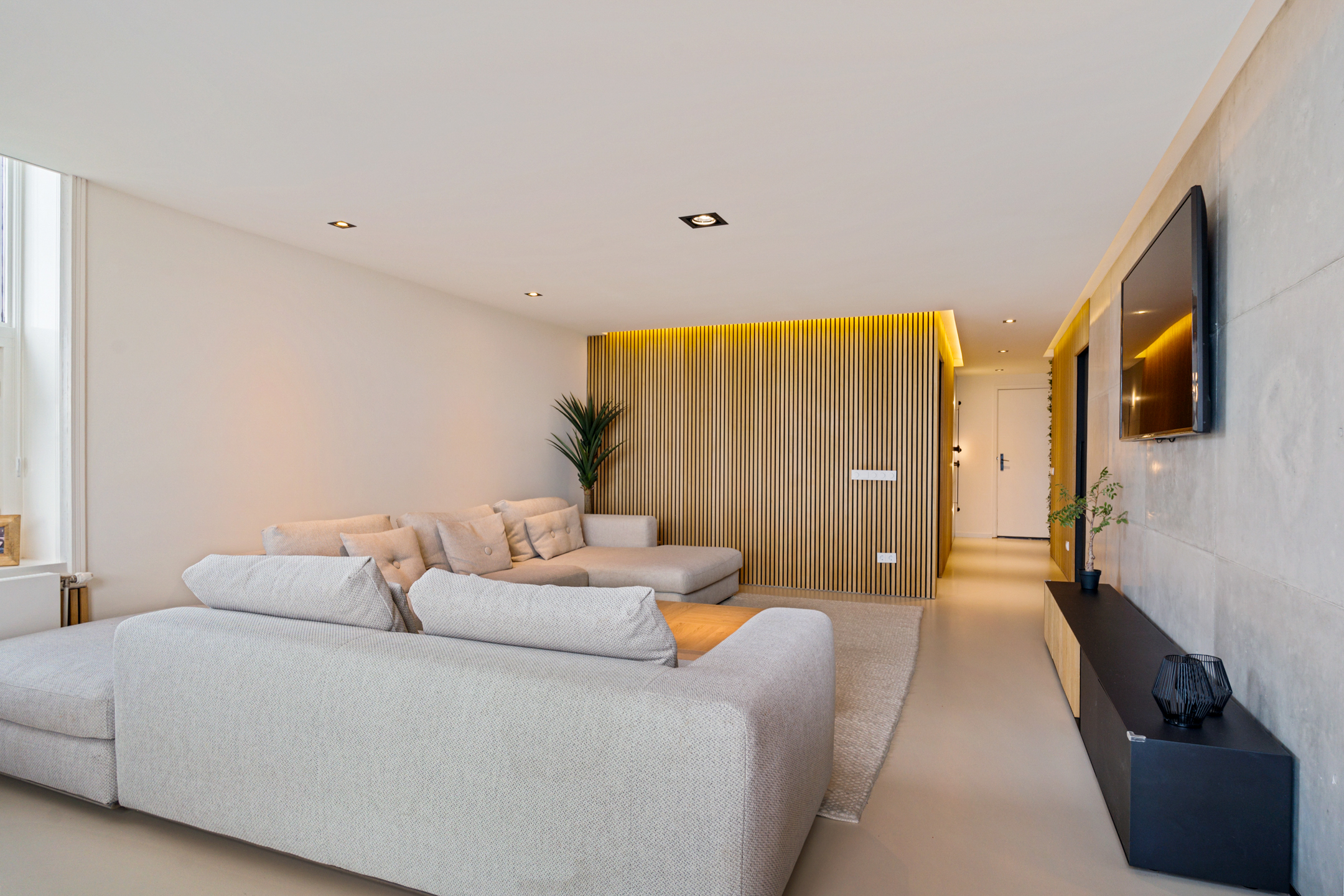 De woonkamer (ca. 54 m²) is uitnodigend, met een verlaagd plafond met spots en een warme, rustige sfeer. Hier komen design en comfort perfect samen – van het lichtspel tot het uitzicht dat elk moment van de dag anders is.