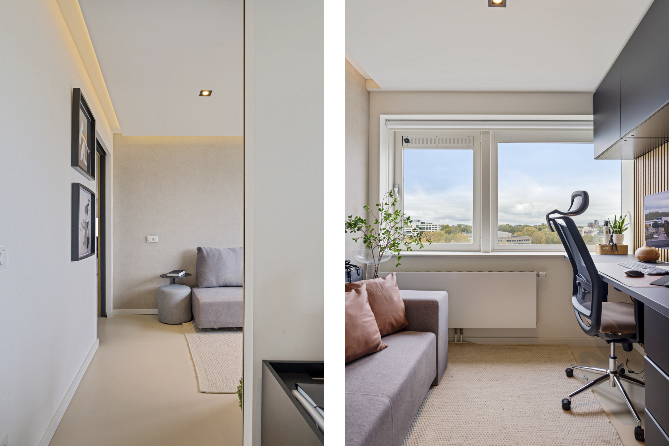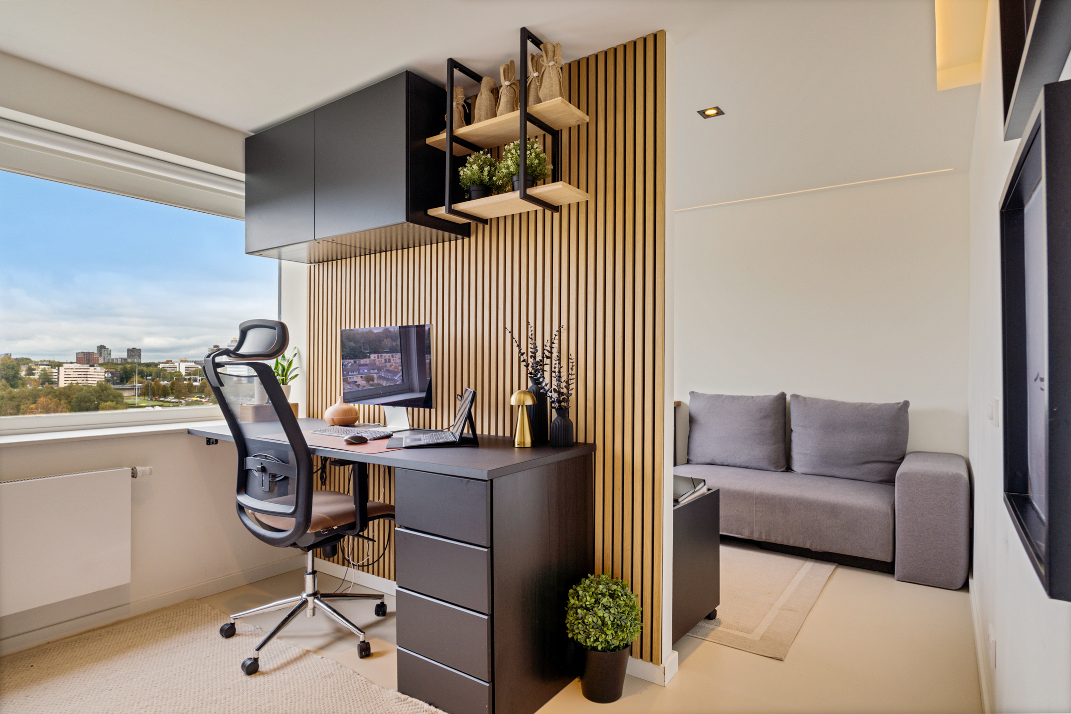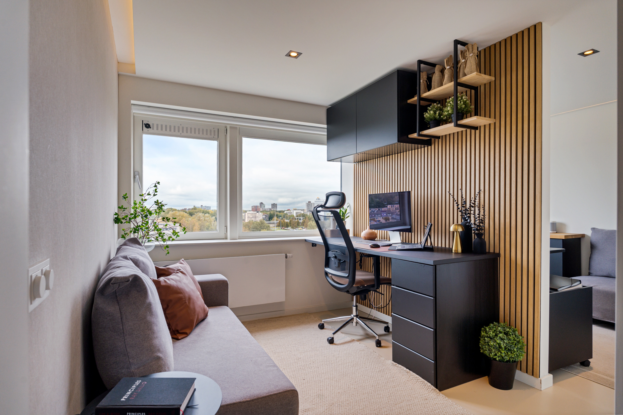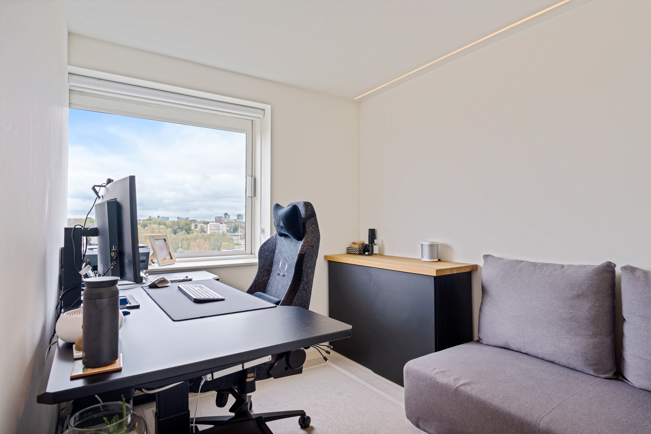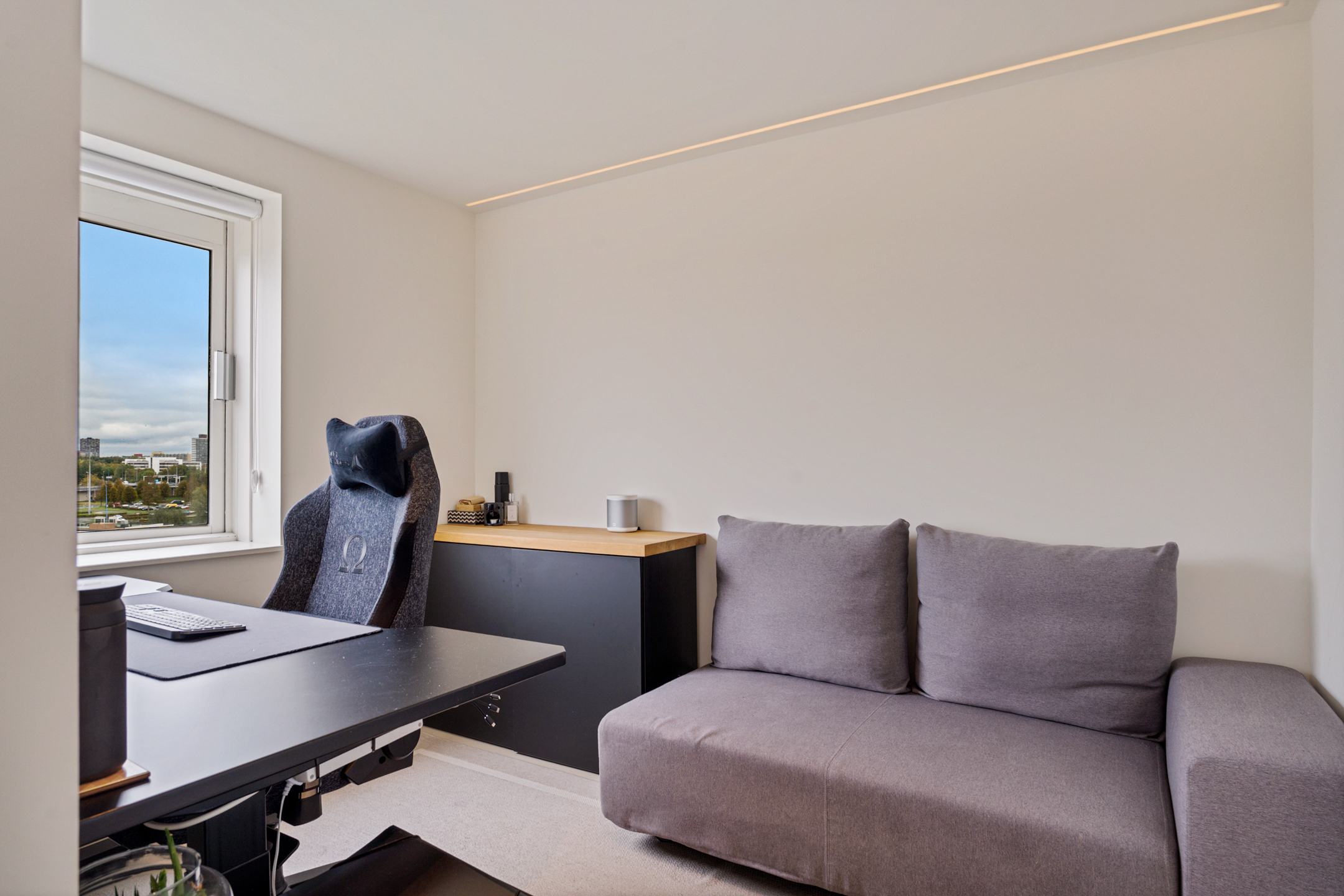 Daarnaast bevindt zich hier een royale kamer van circa 15 m² die momenteel als werkruimte is ingericht, maar eenvoudig kan worden omgevormd tot slaapkamer. Elk detail is hier doordacht; van de verlichting tot de materiaalkeuze.