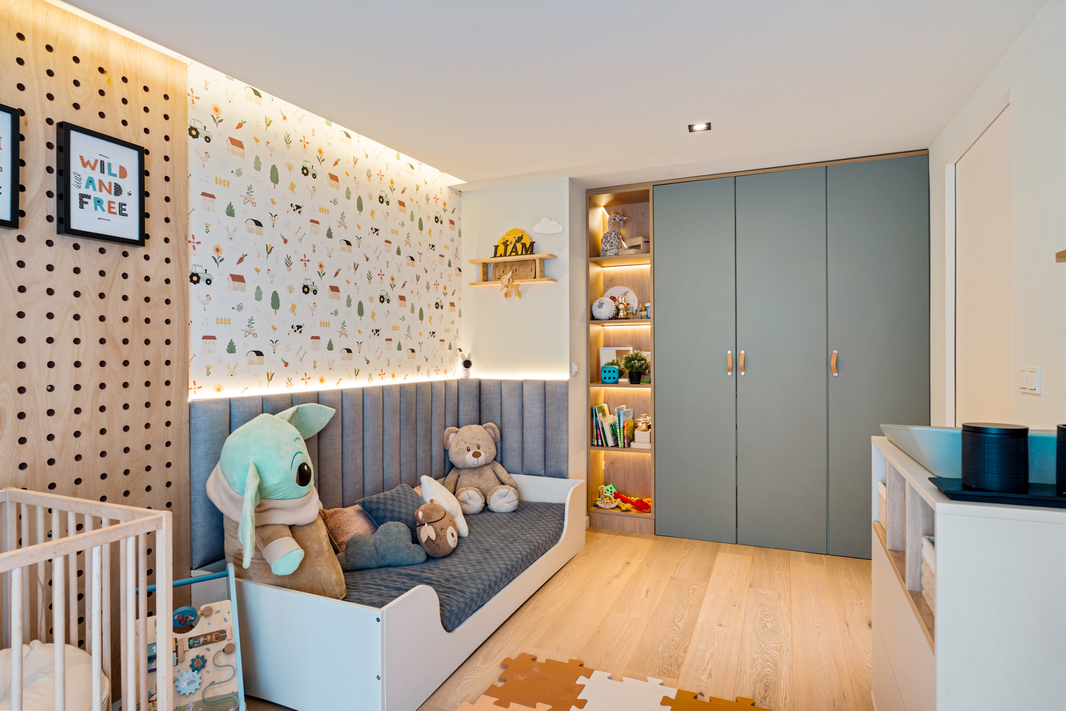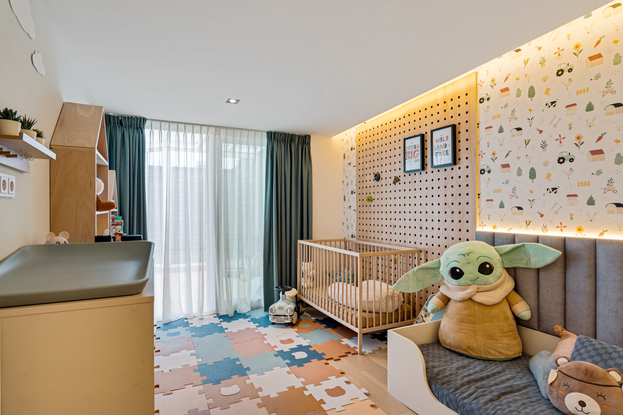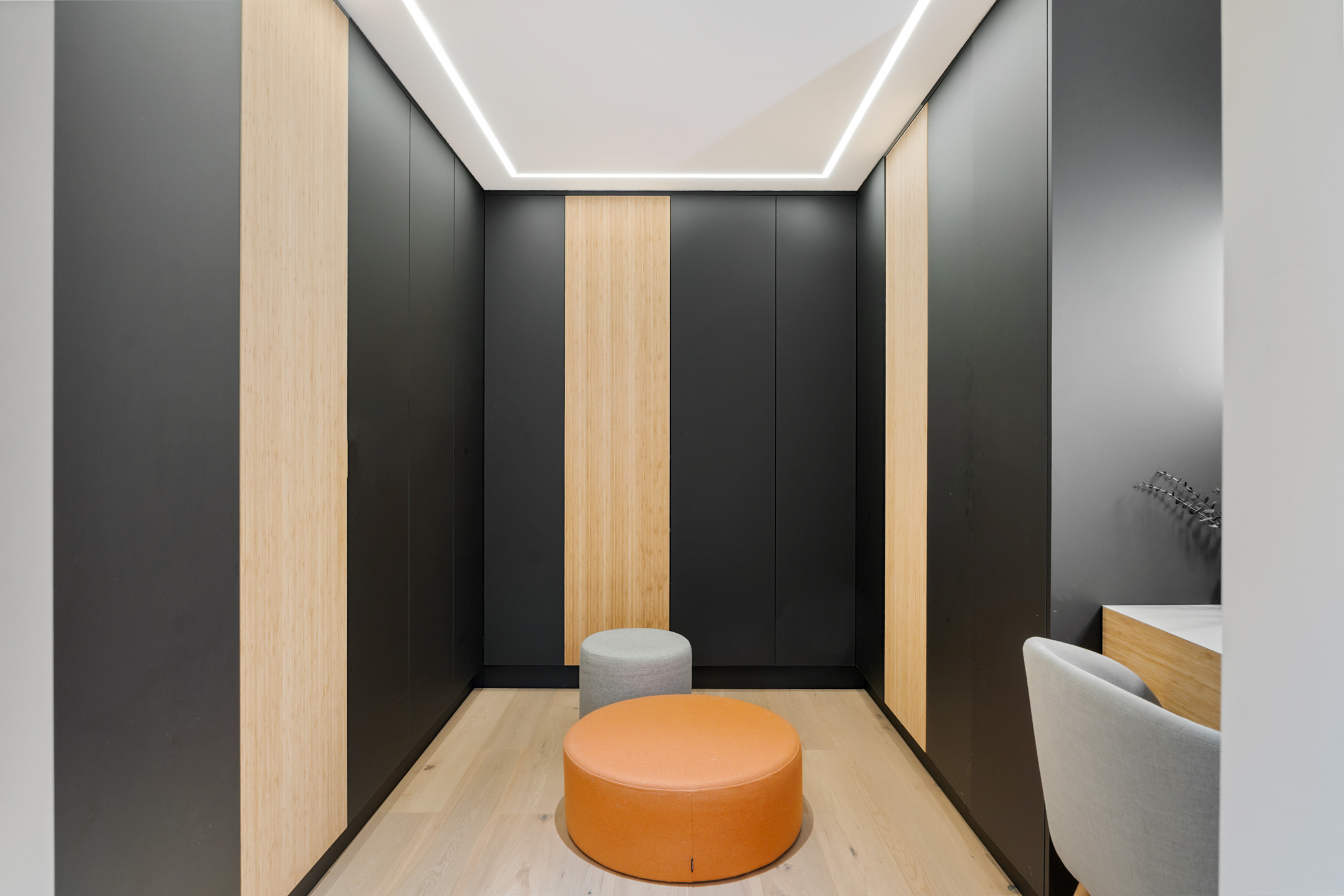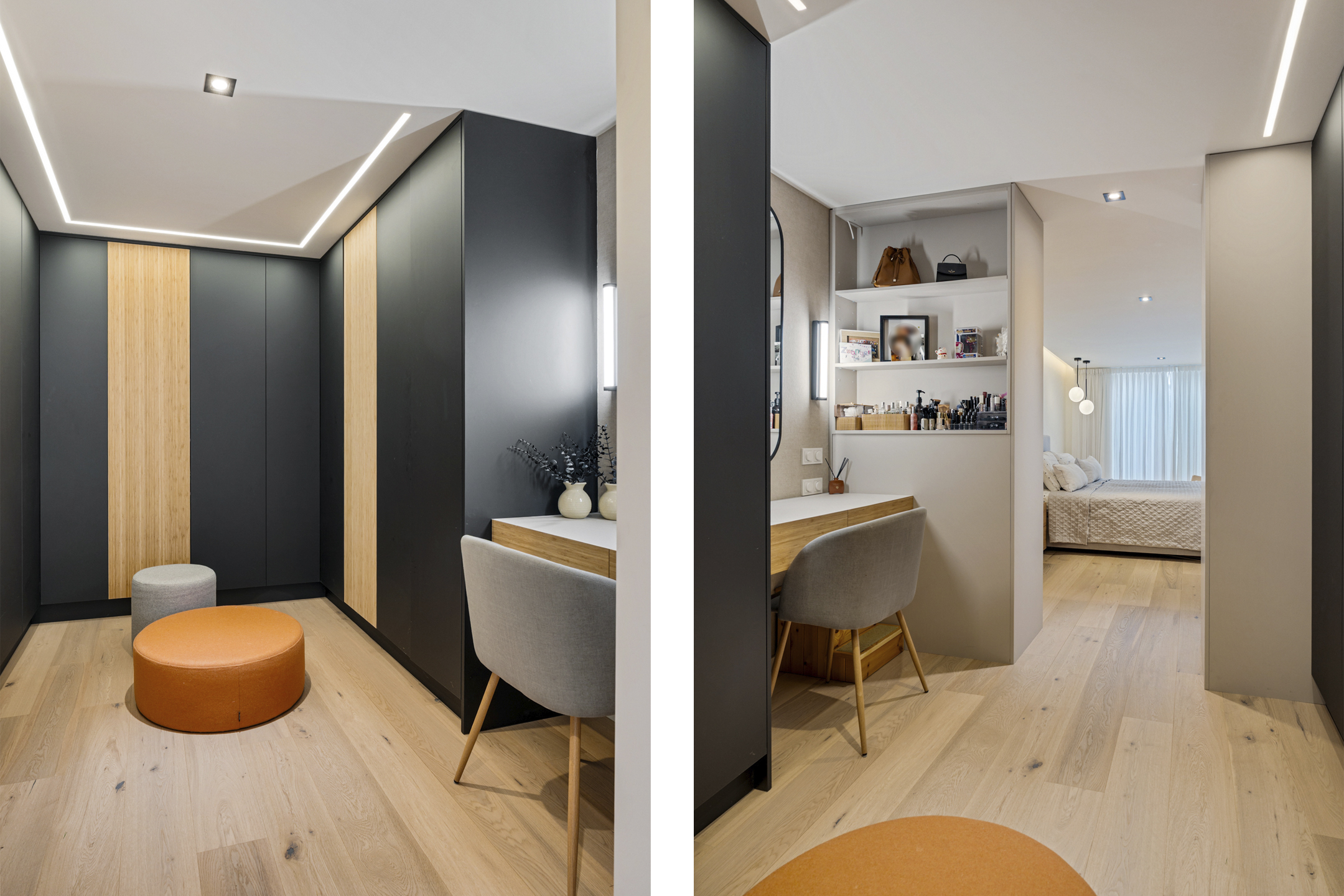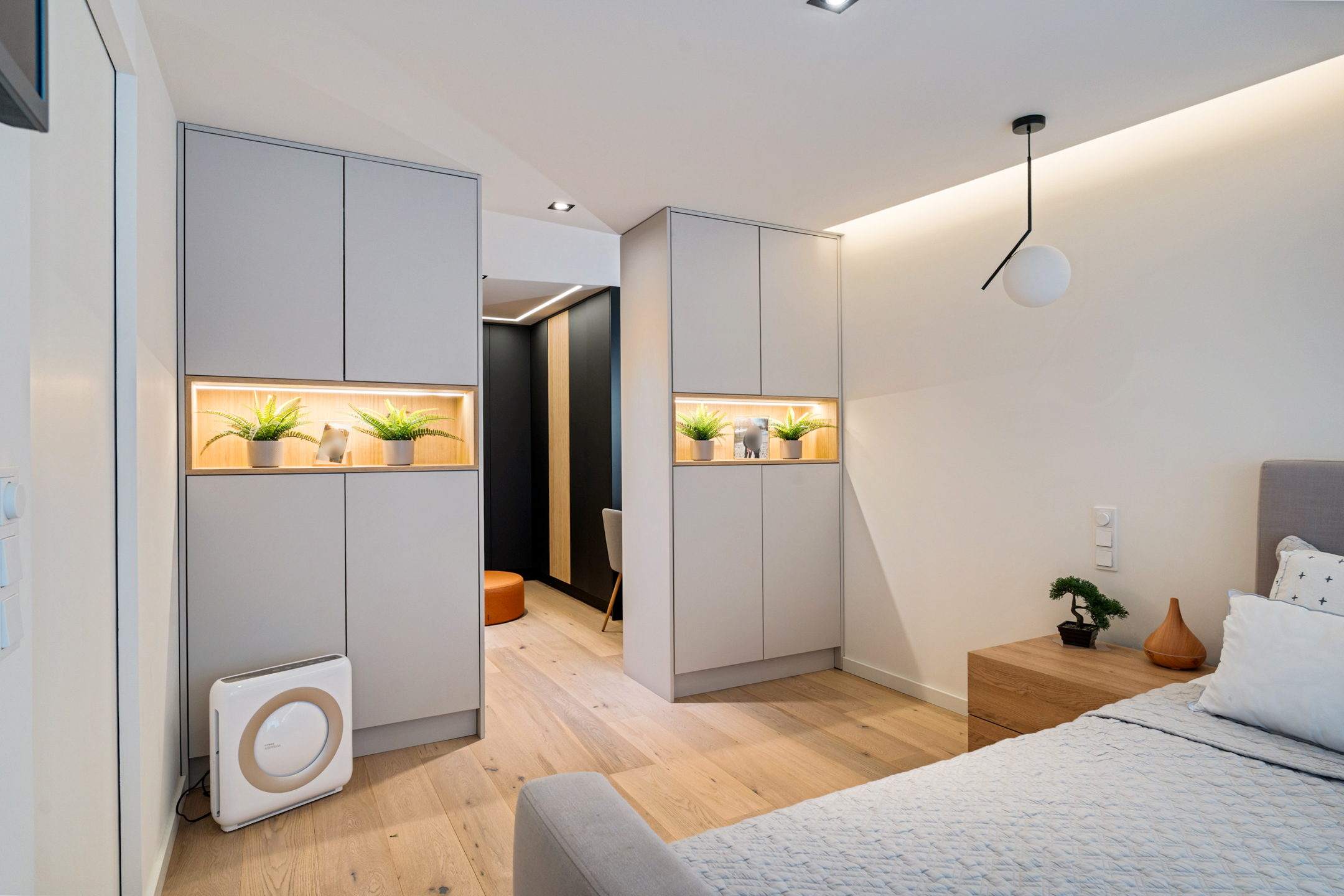 Daarnaast bevindt zich hier een royale kamer van circa 15 m² die momenteel als werkruimte is ingericht, maar eenvoudig kan worden omgevormd tot slaapkamer. Elk detail is hier doordacht; van de verlichting tot de materiaalkeuze.