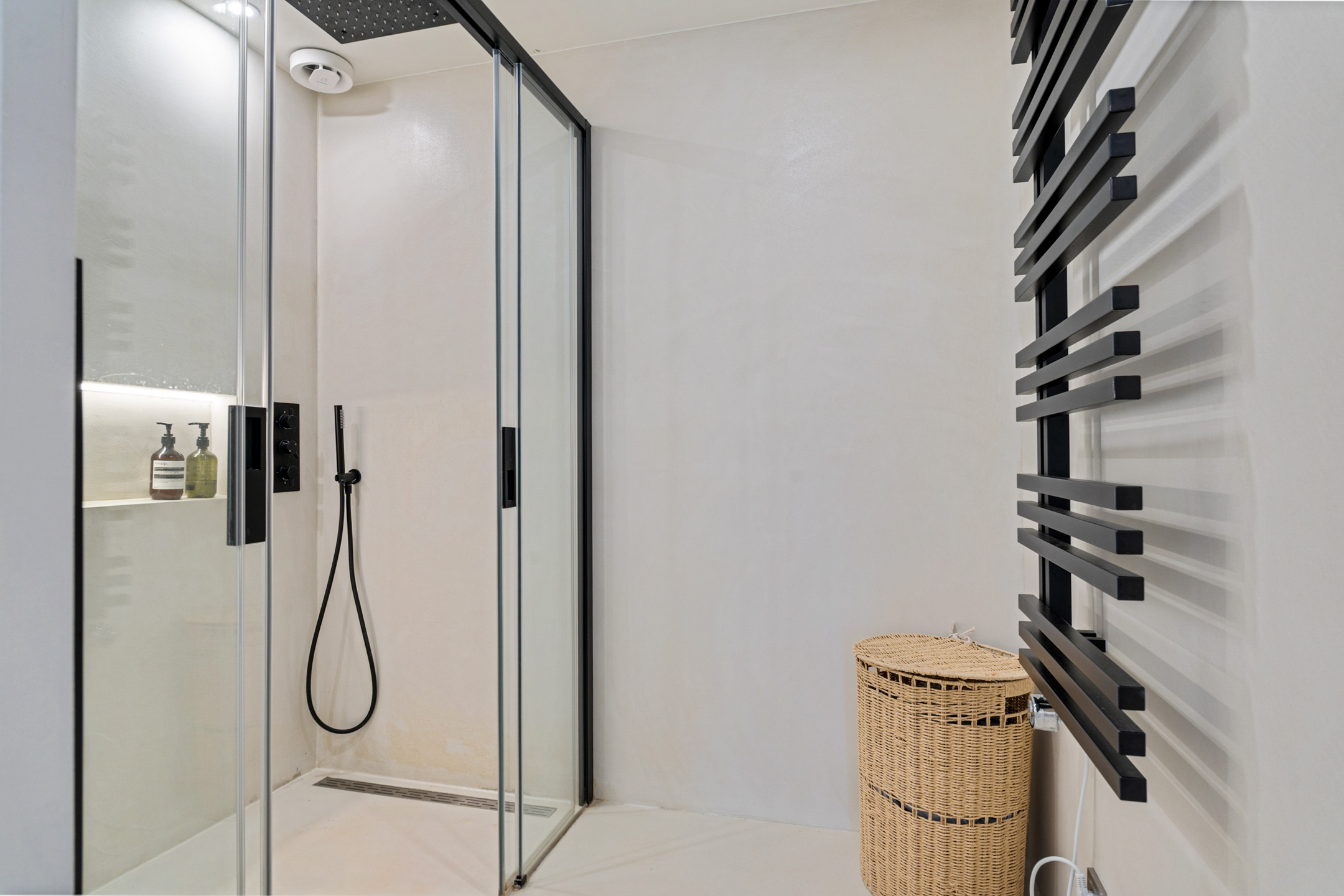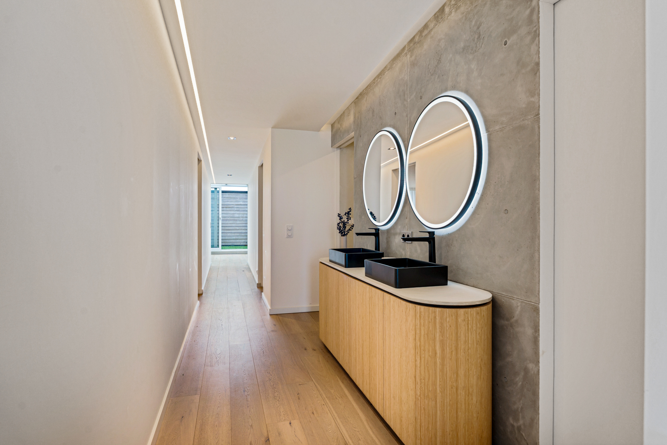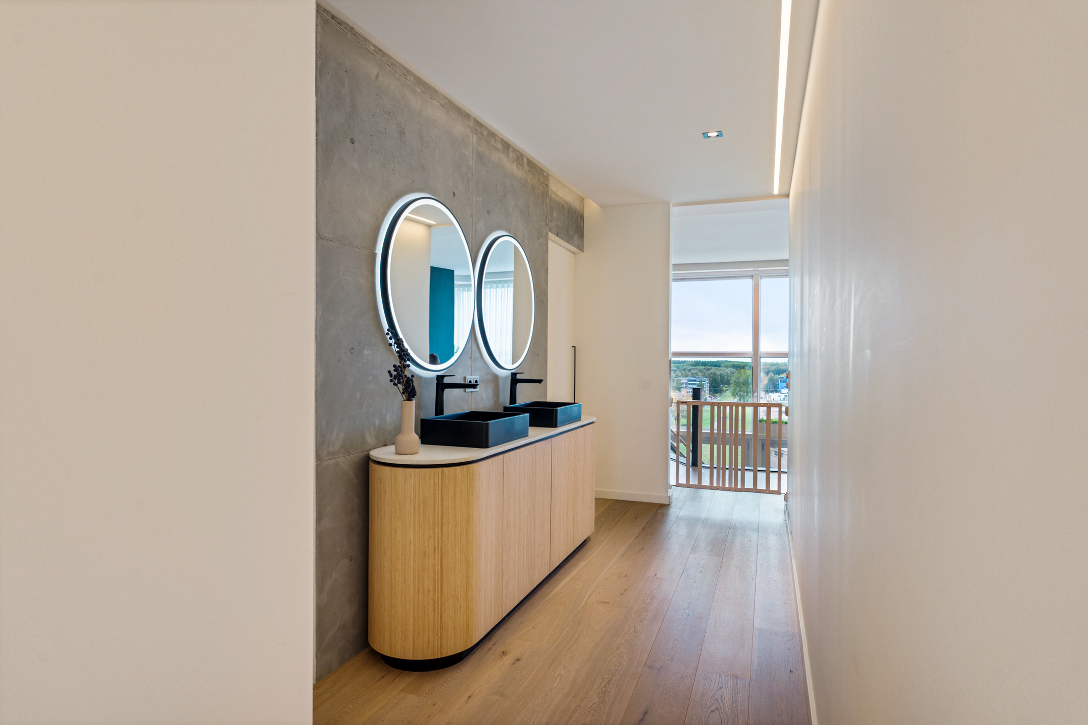 De tweede badkamer straalt dezelfde luxe uit als de rest van de woning. De dubbele inloopdouche met twee regendouches is afgewerkt met hoogwaardige materialen. Tussen badkamer en separaat toilet bevindt zich een stijlvol wastafelmeubel met zwarte kranen – precies afgestemd op het interieur. Ook bevindt zich hier nog een derde slaapkamer.