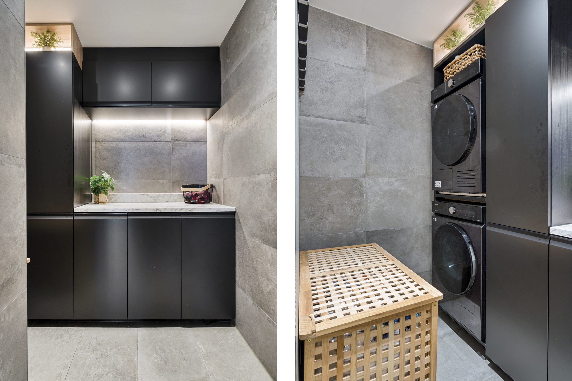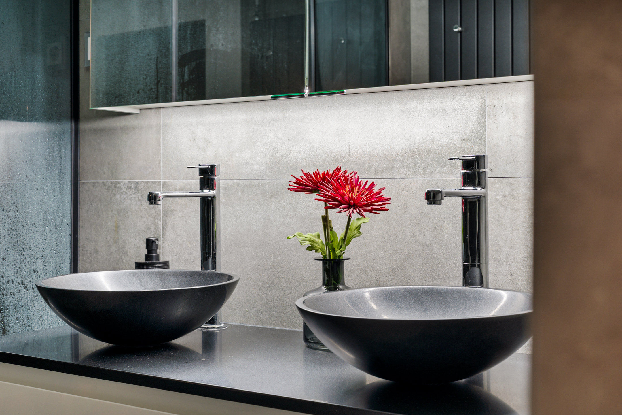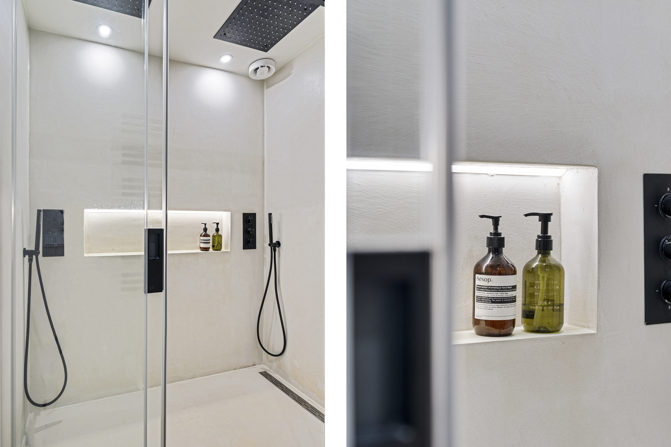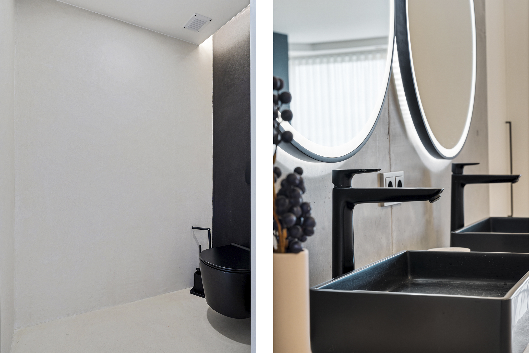 De tweede badkamer straalt dezelfde luxe uit als de rest van de woning. De dubbele inloopdouche met twee regendouches is afgewerkt met hoogwaardige materialen. Tussen badkamer en separaat toilet bevindt zich een stijlvol wastafelmeubel met zwarte kranen – precies afgestemd op het interieur. Ook bevindt zich hier nog een derde slaapkamer.