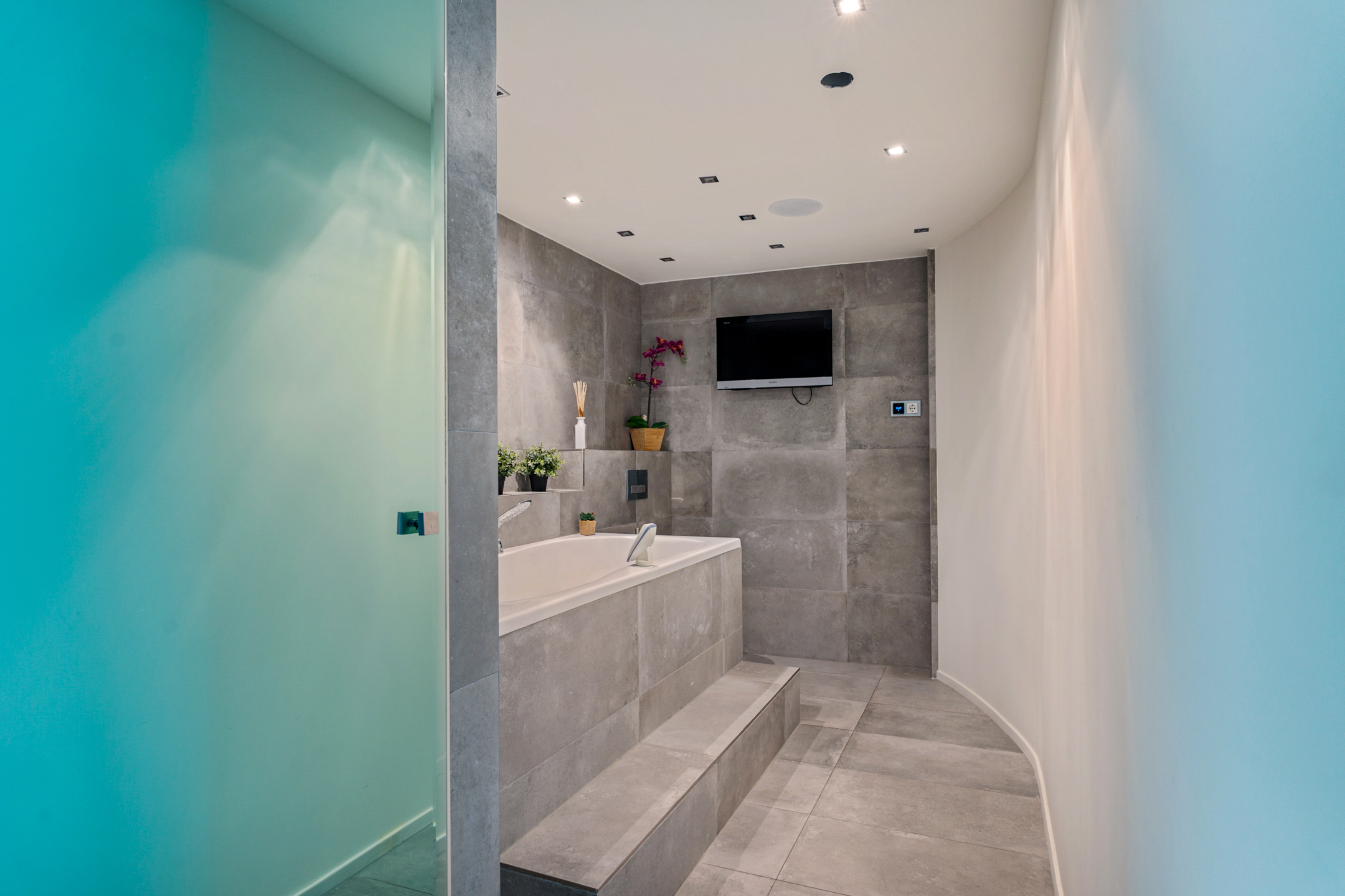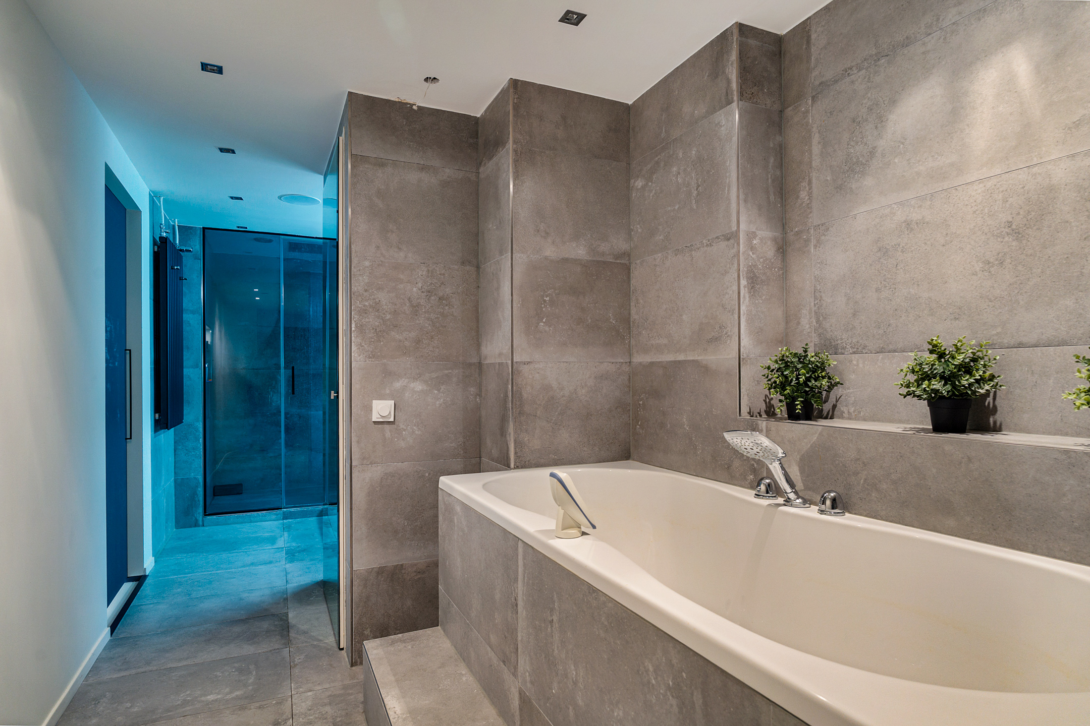 De lift opent direct op de overloop van dit indrukwekkende appartement. De entree is ruim en strak afgewerkt en biedt toegang tot een luxe badkamer met stoomcabine/sauna, whirlpool, dubbele wastafel en toilet – een complete wellnessruimte in huis.