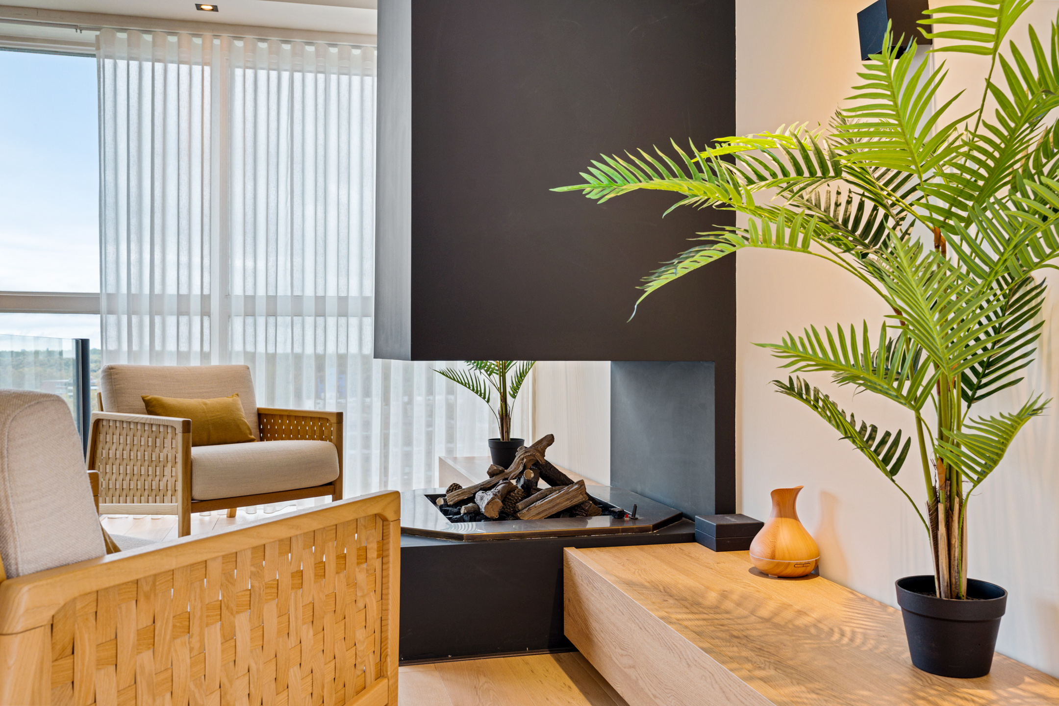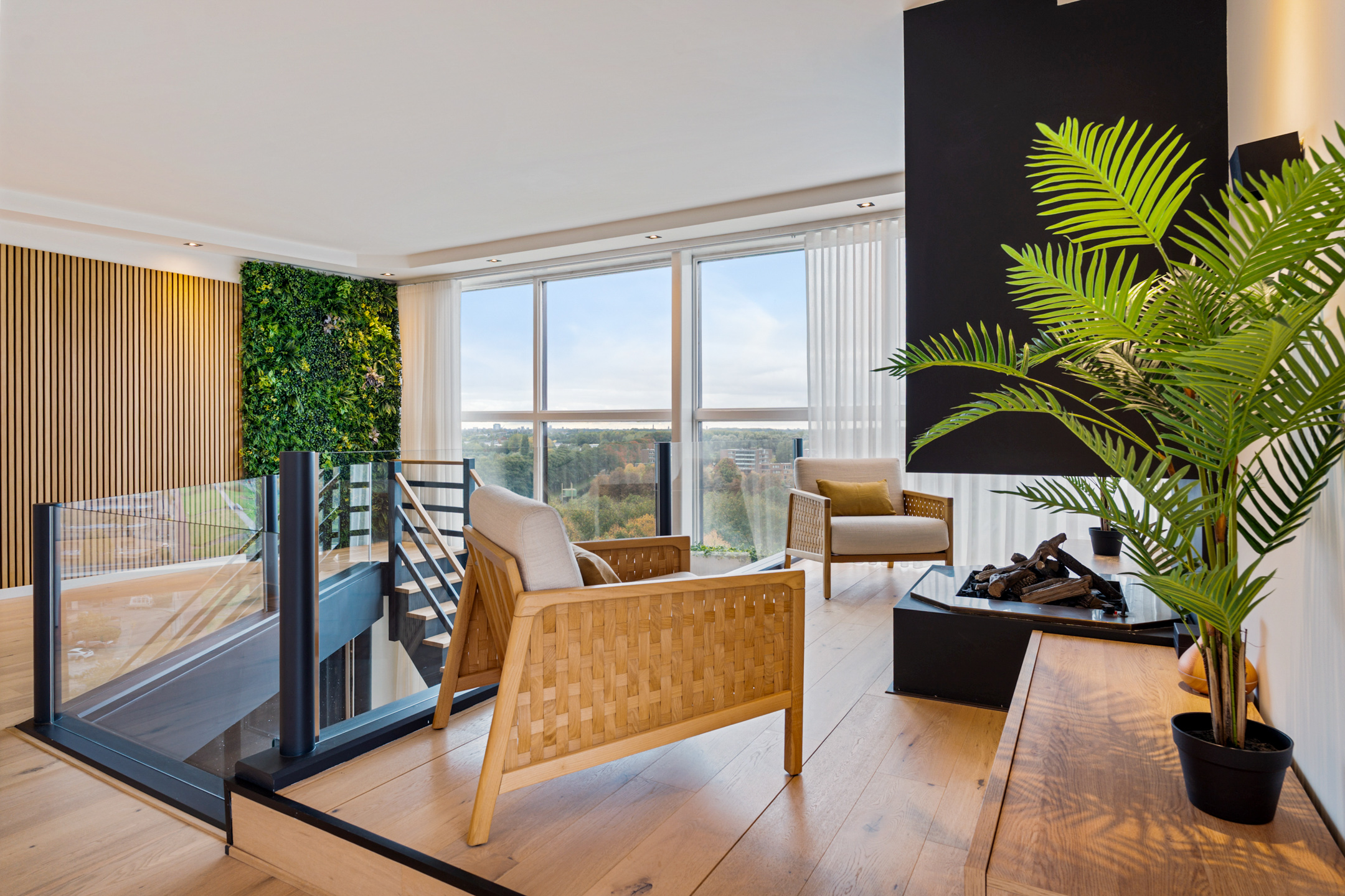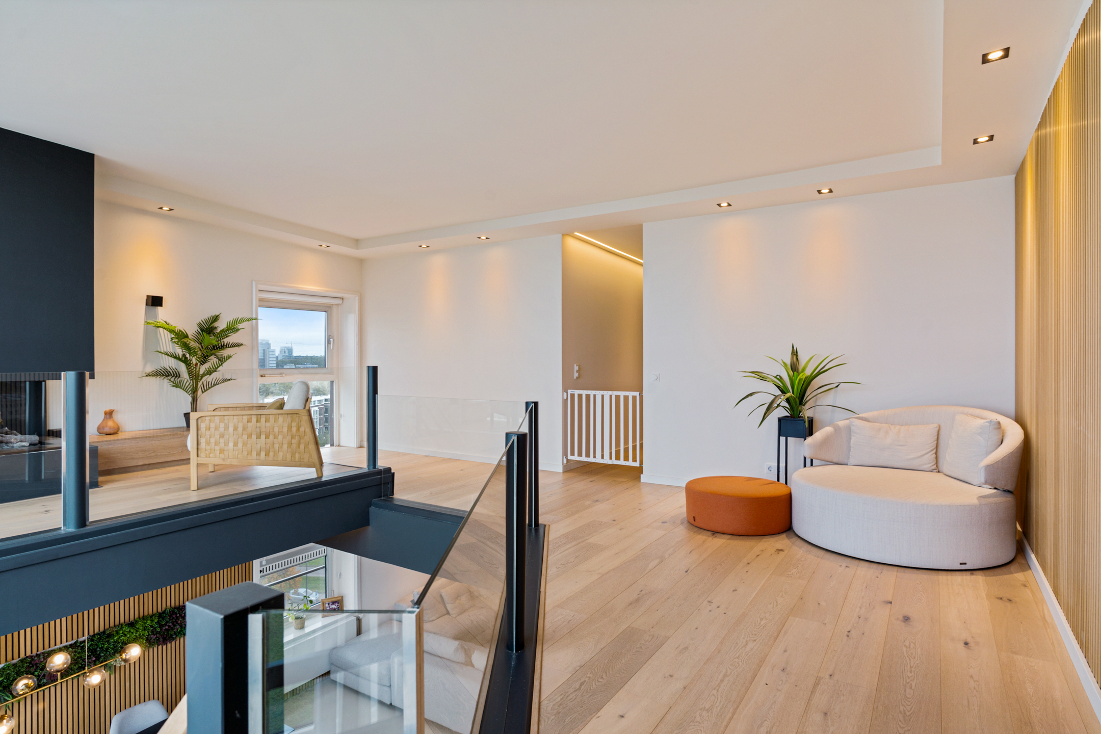 De stijlvolle trap leidt naar de bovenverdieping, waar de woning nog indrukwekkender wordt. De overloop met vide en open haard vormt het middelpunt van deze etage – een plek waar je automatisch even stilstaat. De ruimte is royaal, licht en sfeervol ingericht, perfect voor een tweede zithoek of werkplek.