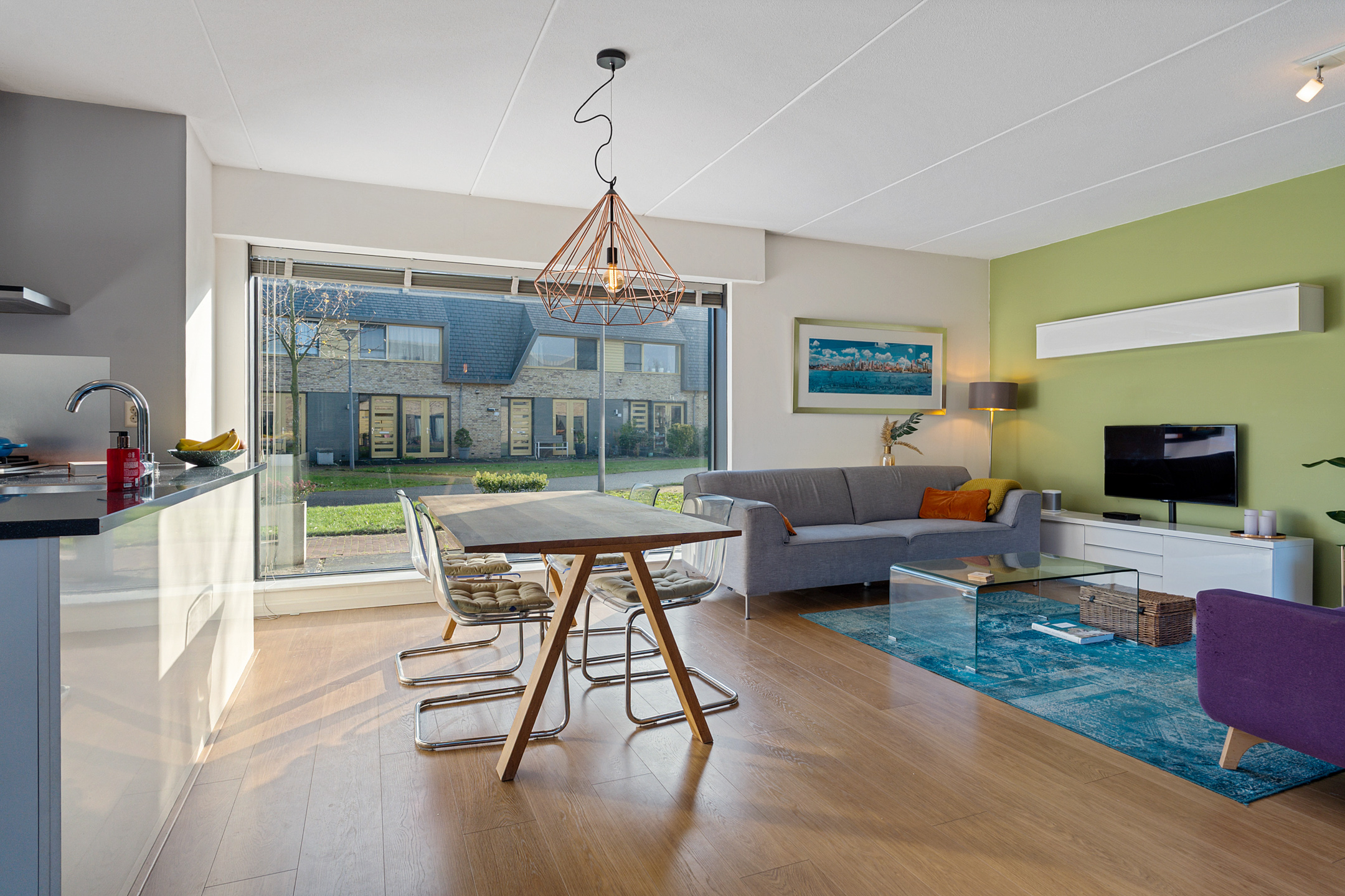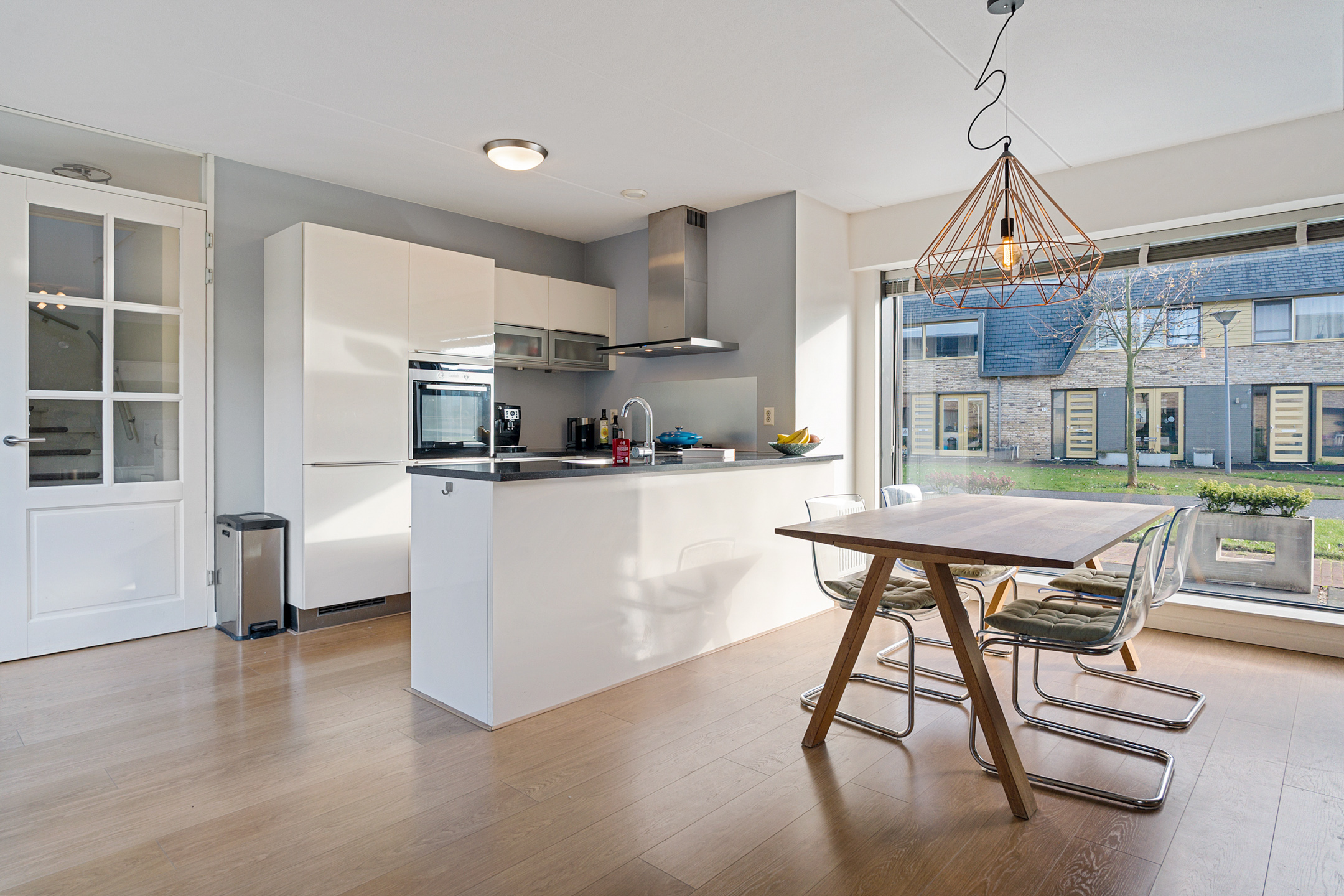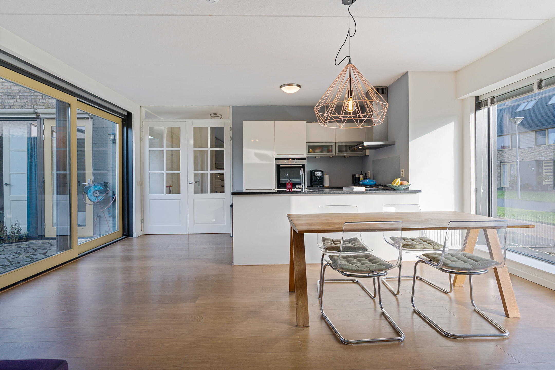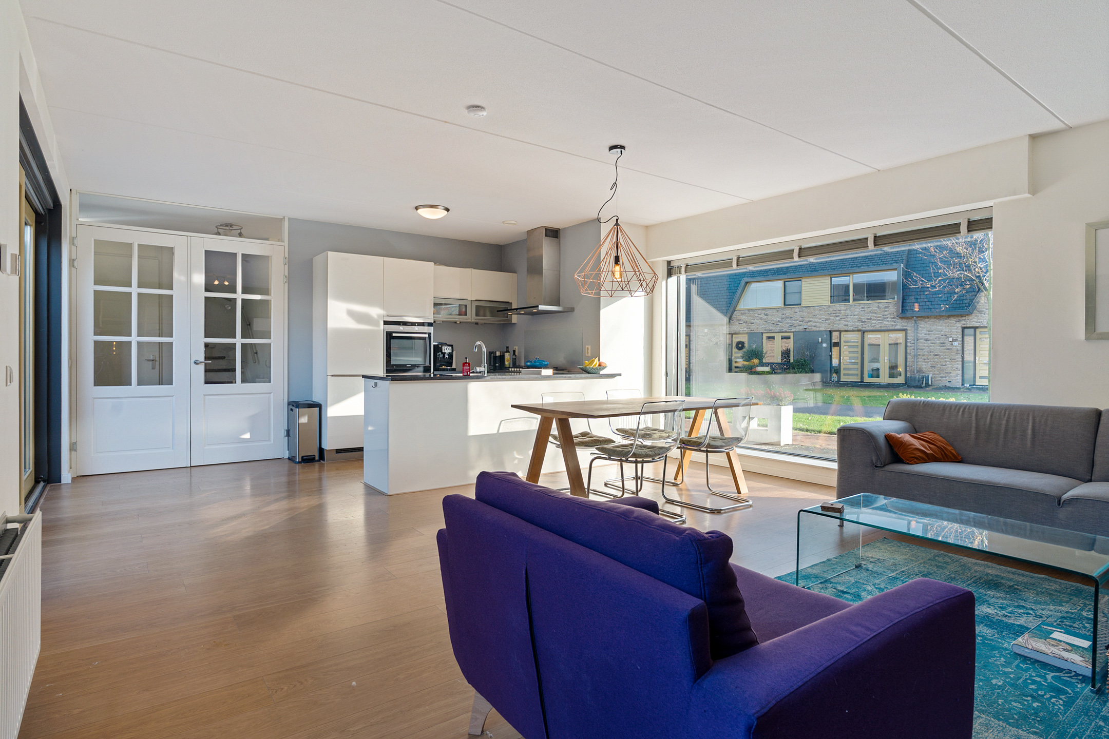 De woonkamer is ruim en licht, met een schuifpui naar de patio. De open keuken in U-opstelling is strak uitgevoerd en voorzien van inbouwapparatuur, een heerlijke plek om te koken en gasten te ontvangen.