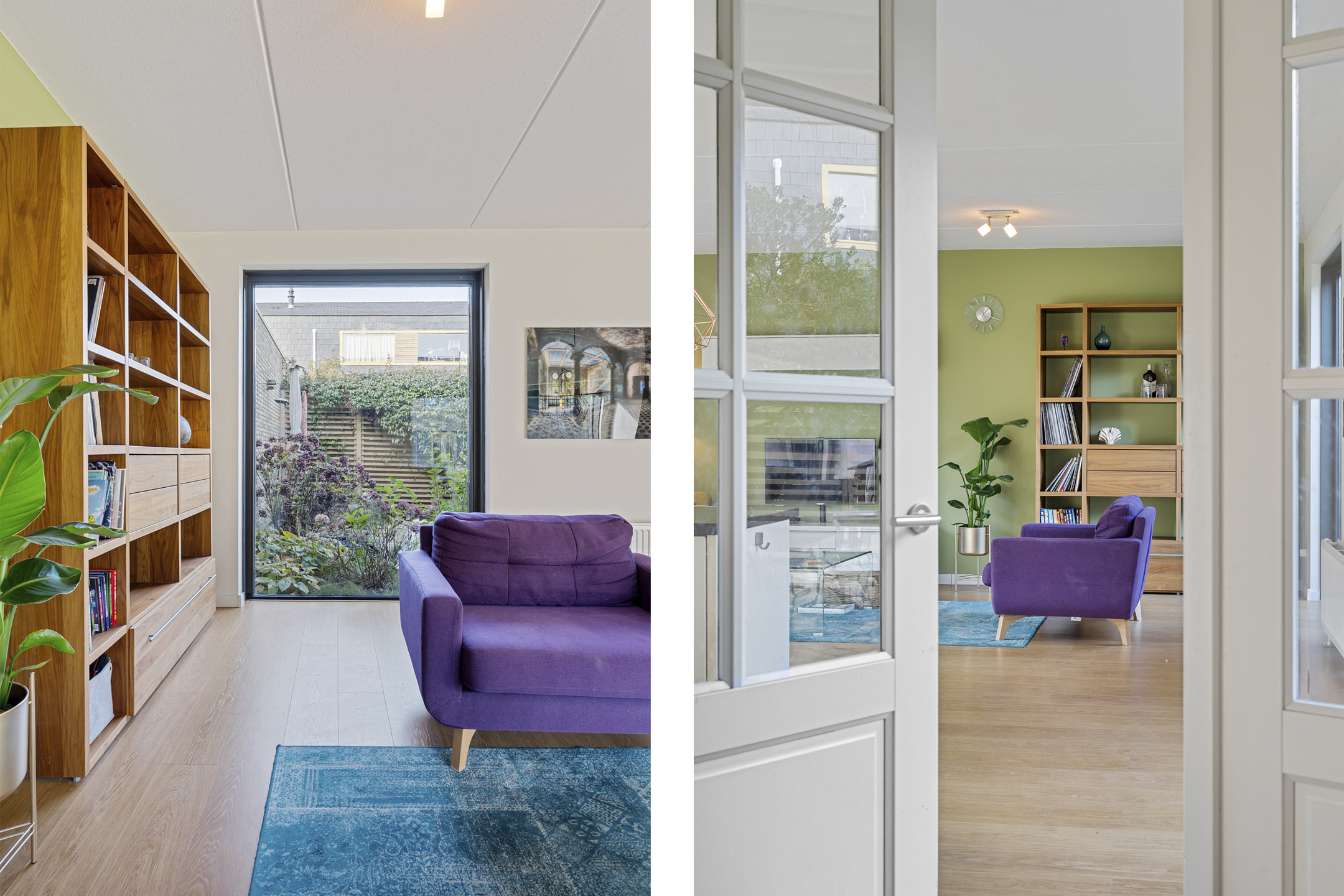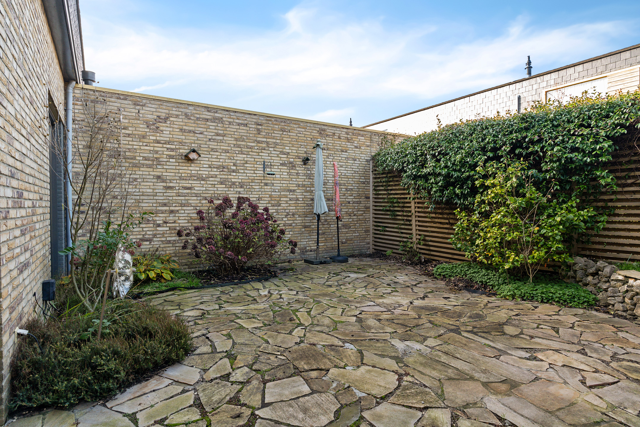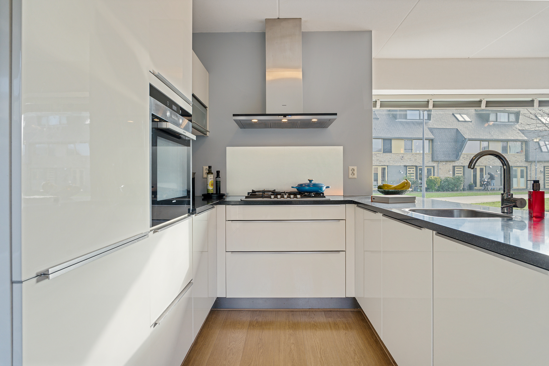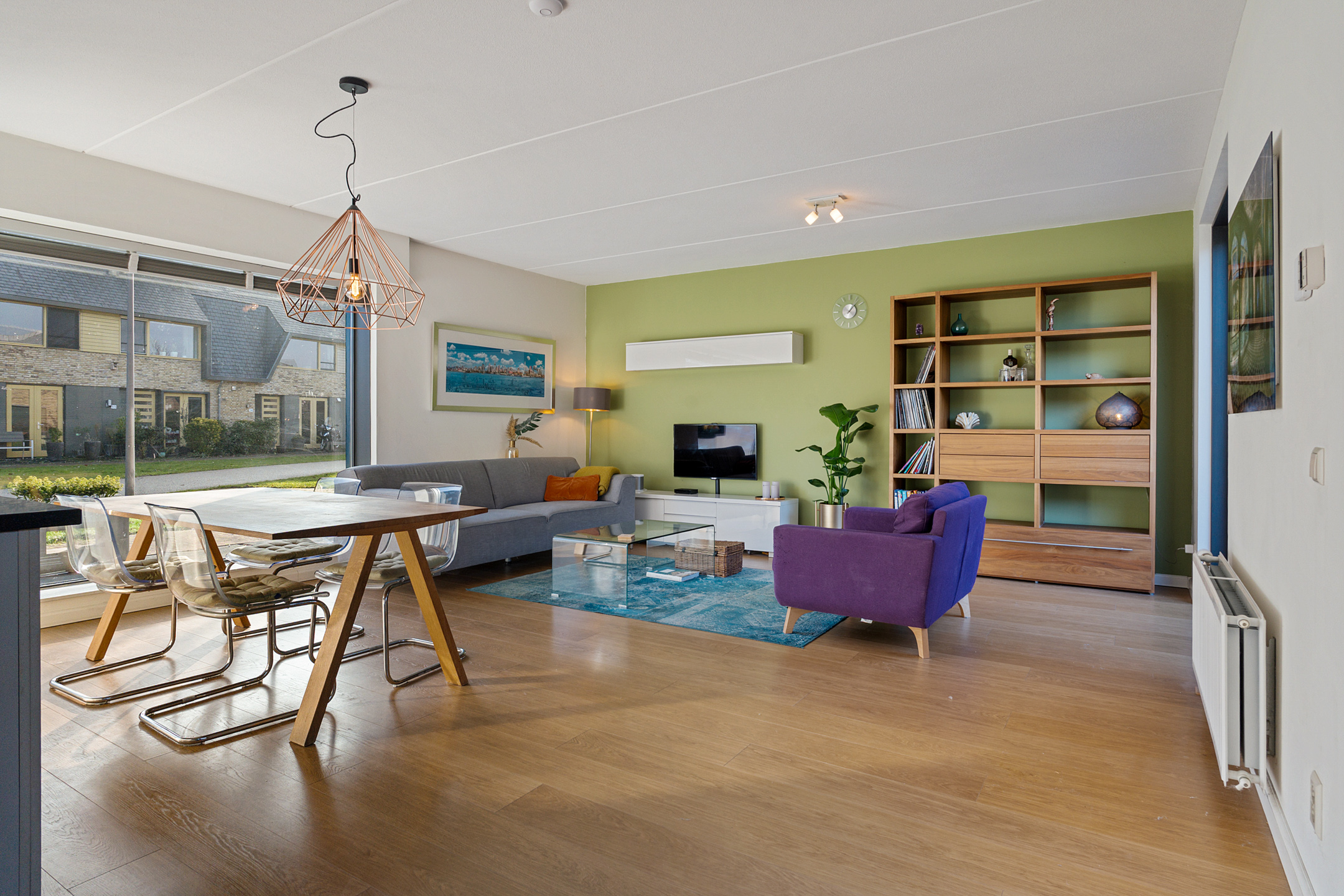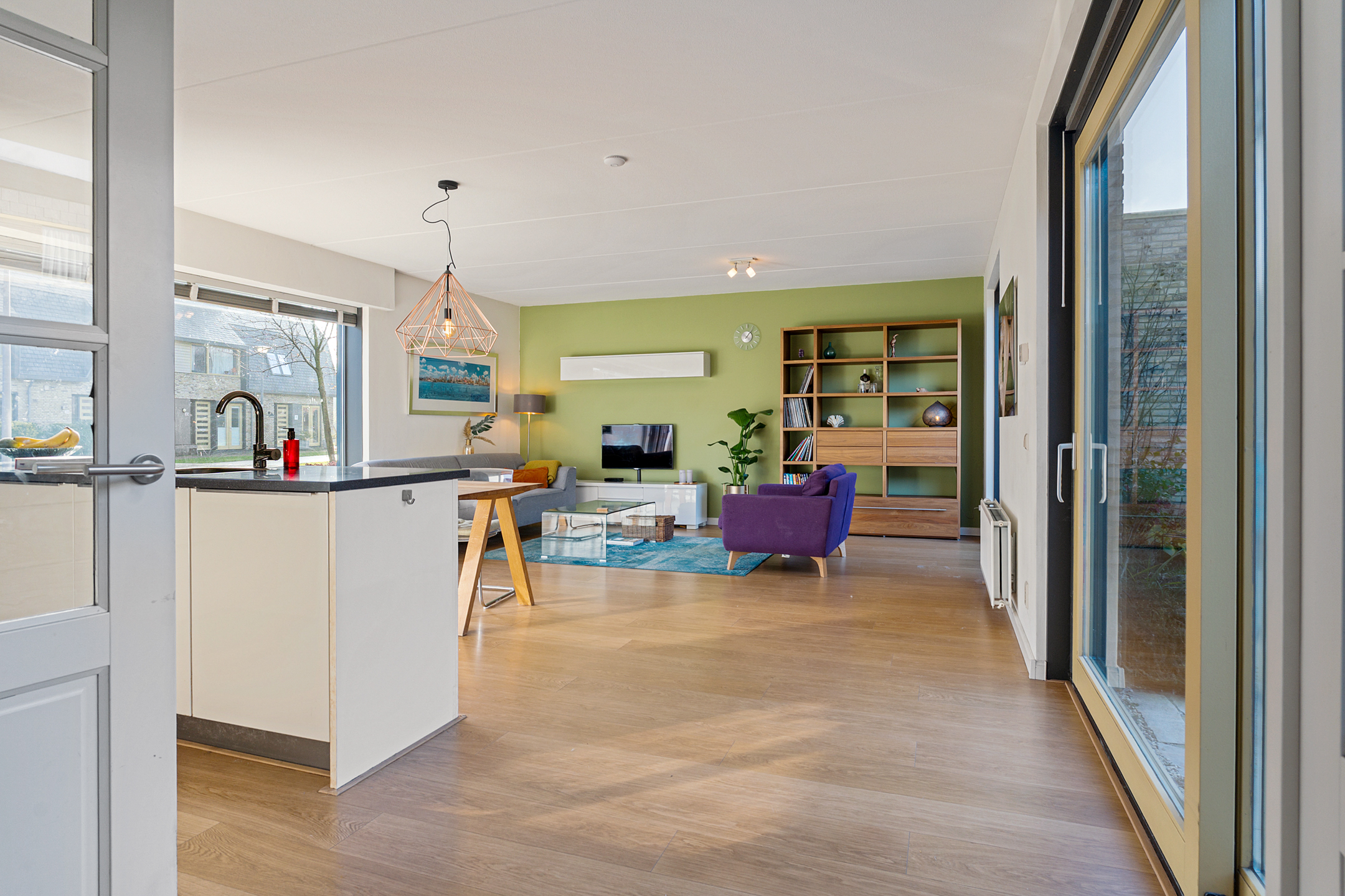 De woonkamer is ruim en licht, met een schuifpui naar de patio. De open keuken in U-opstelling is strak uitgevoerd en voorzien van inbouwapparatuur, een heerlijke plek om te koken en gasten te ontvangen.