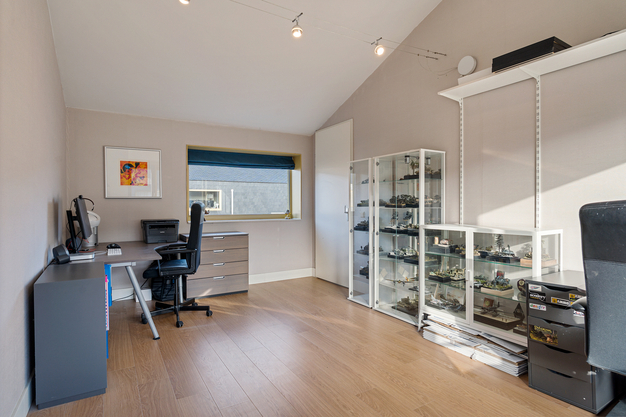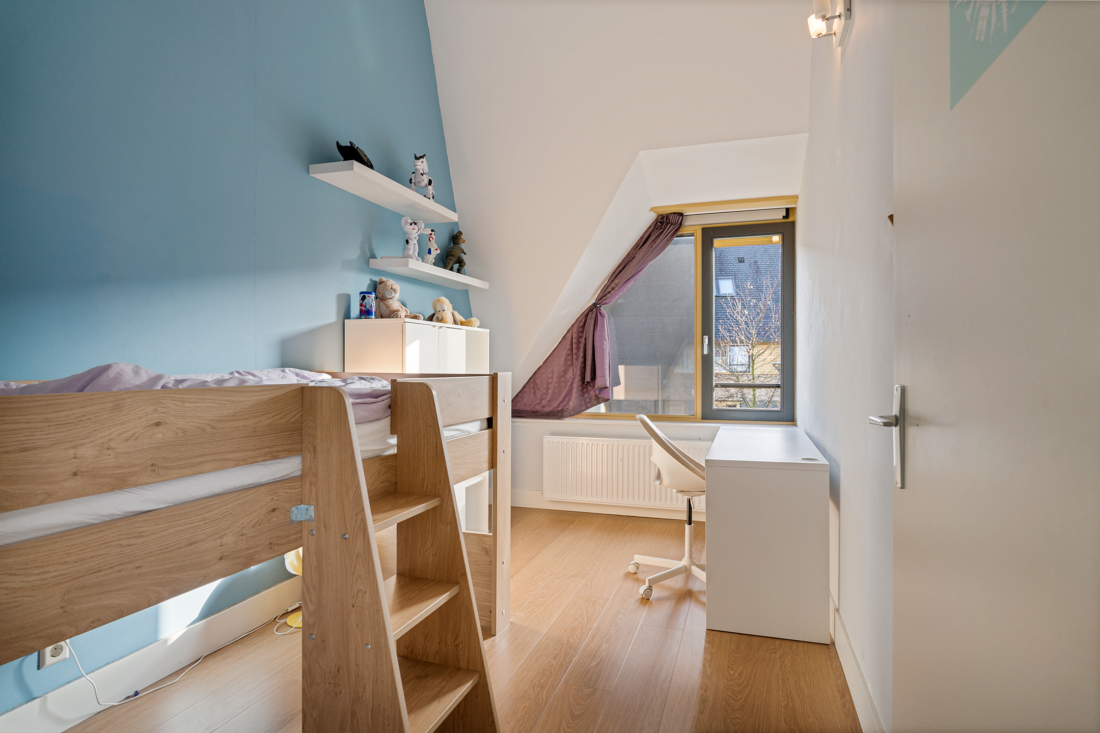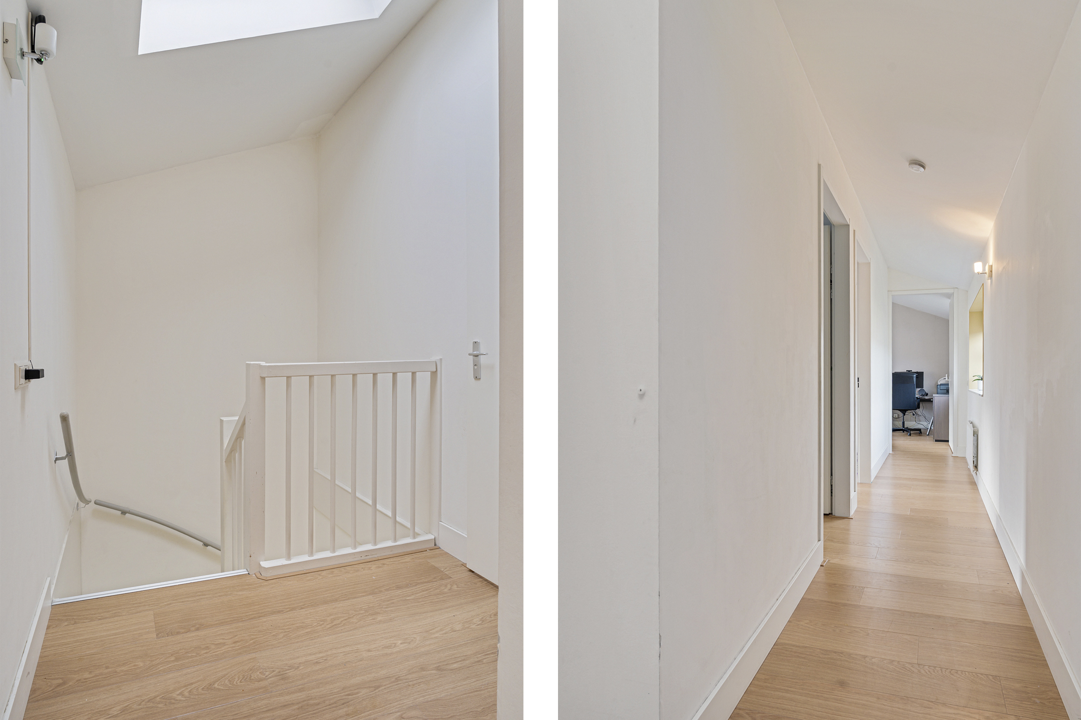 Op de eerste verdieping valt het licht meteen op dankzij het dakvenster op de overloop. De badkamer is compleet uitgerust met een ligbad, douche, toilet en wastafelmeubel met natuurlijke ventilatie via een dakraam. Er zijn drie slaapkamers op deze verdieping: twee aan de voorzijde met dakkapel, eentje met vliering, en een royale hoofdslaapkamer aan de achterzijde met extra raampartij en veel lichtinval.