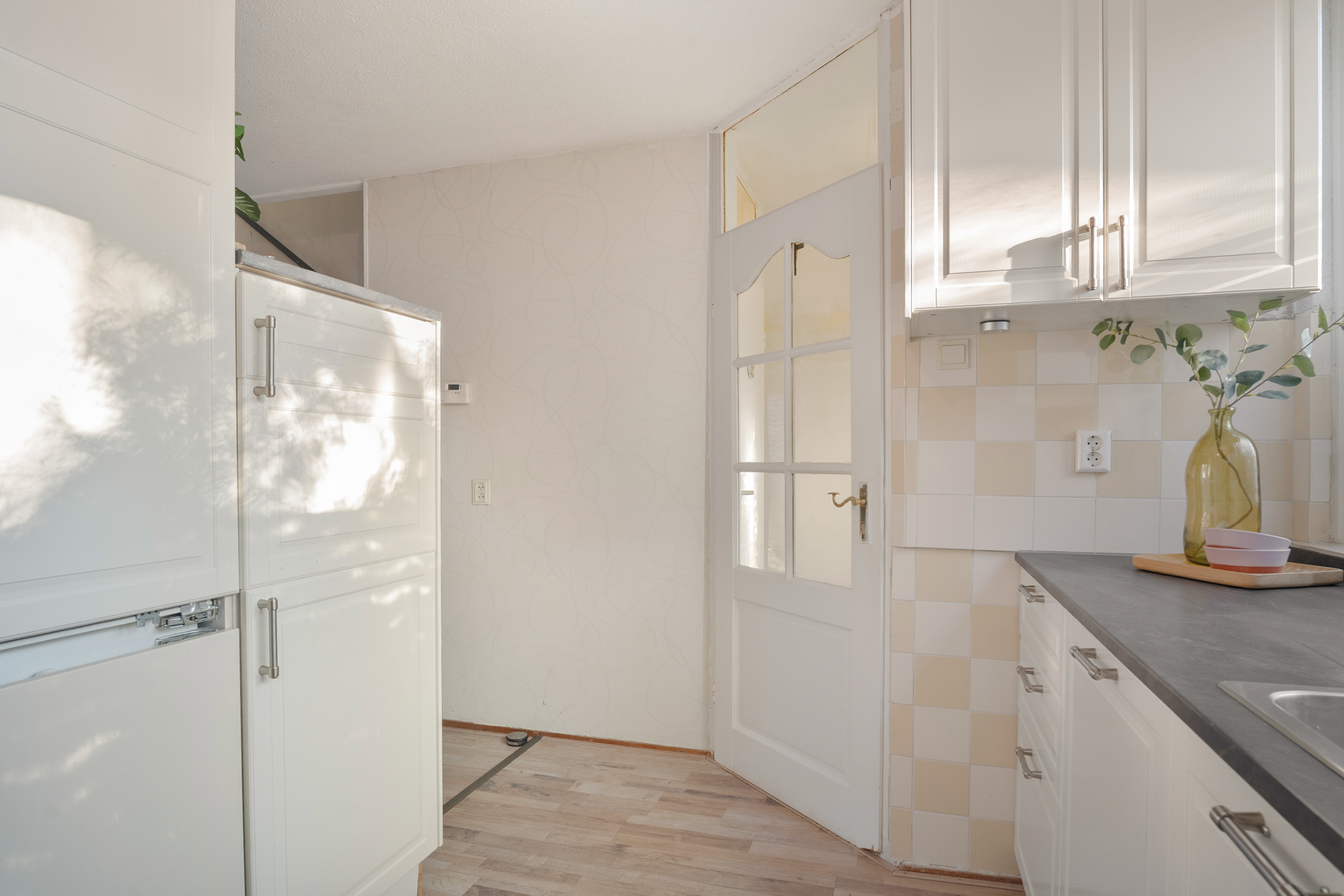 Je betreedt de woning via de entreehal met meterkast en een keurig toilet met fonteintje. Vanuit hier stap je de lichte woonkamer in, die zich over de volledige diepte van het huis uitstrekt. Dankzij het grote raam aan de achterzijde en de deur naar de tuin geniet je hier van veel natuurlijk licht.