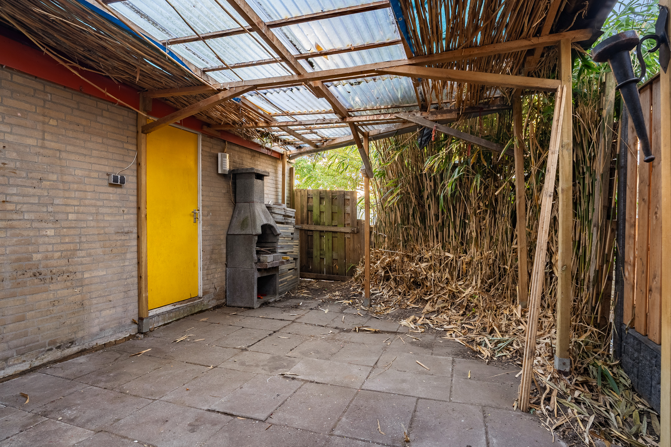 De achtertuin biedt ruimte voor een lounge- of eethoek en is gelegen op het Westen. Achterin staat een vrijstaande stenen berging en er is een achterom aanwezig.